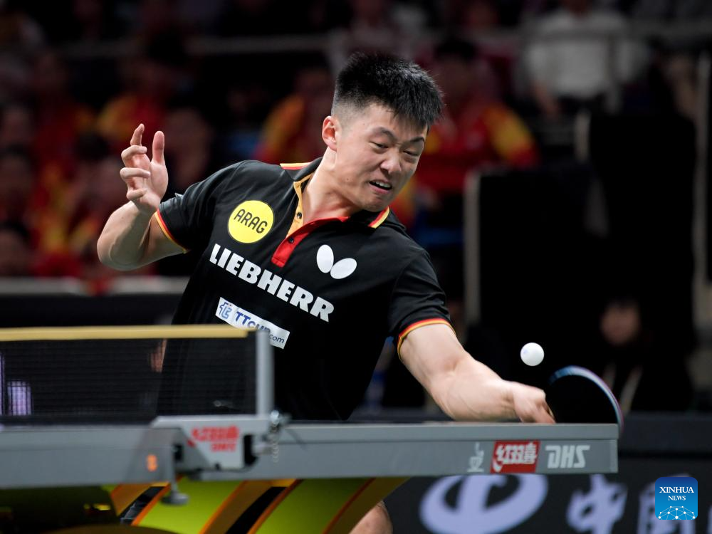 Meng Fanbo of Germany hits a return to Liang Jingkun of China during the men's singles match of the stage 2 group match between China and Germany at the ITTF Mixed Team World Cup 2024 in Chengdu, southwest China's Sichuan Province, Dec. 4, 2024. (Xinhua/Wang Xi)