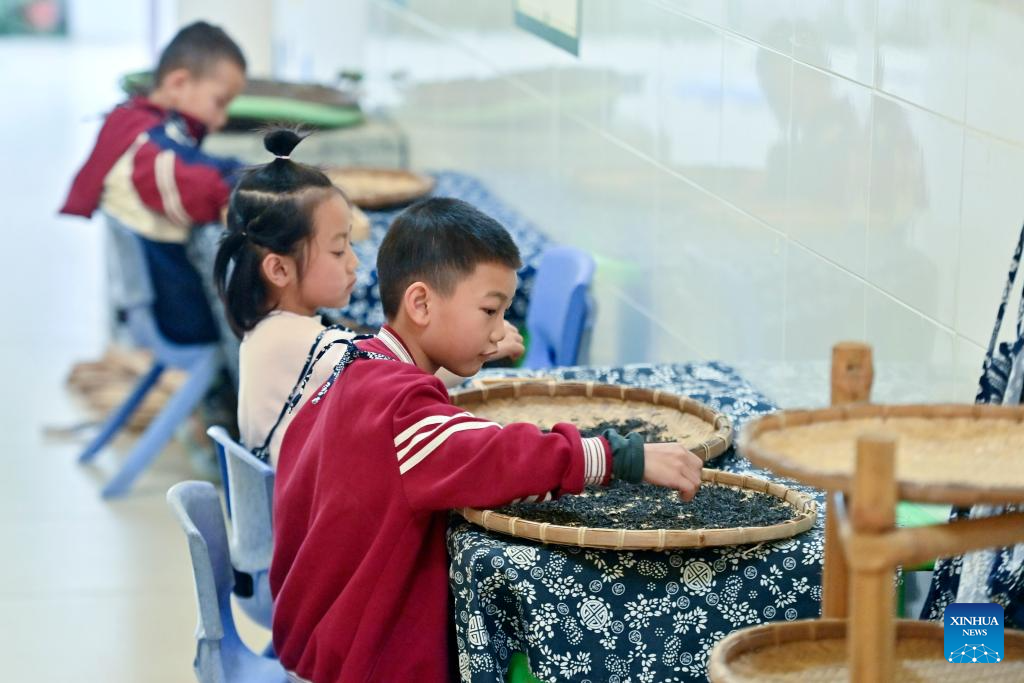 Students have a tea-making class at Tangping Primary School in Liubao Town of Cangwu County in Wuzhou City, south China's Guangxi Zhuang Autonomous Region, Dec. 3, 2024. In recent years, Liubao Town has introduced the promotion of Liubao tea culture into classrooms, offering a series of courses to advance the inheritance and development of the tea.