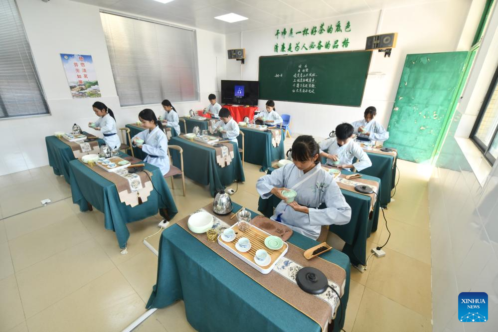 Students have a tea art class at a school in Liubao Town of Cangwu County in Wuzhou City, south China's Guangxi Zhuang Autonomous Region, Dec. 3, 2024. In recent years, Liubao Town has introduced the promotion of Liubao tea culture into classrooms, offering a series of courses to advance the inheritance and development of the tea.