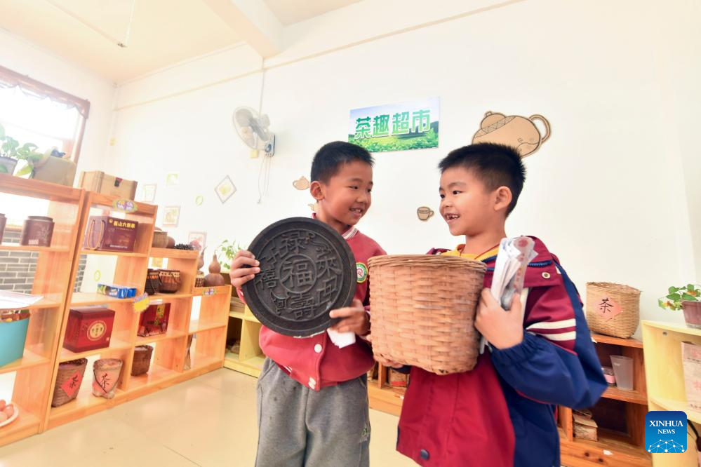 Children simulate buying tea at a kindergarten in Liubao Town of Cangwu County in Wuzhou City, south China's Guangxi Zhuang Autonomous Region, Dec. 3, 2024. In recent years, Liubao Town has introduced the promotion of Liubao tea culture into classrooms, offering a series of courses to advance the inheritance and development of the tea.