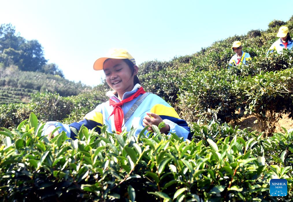 Students pick tea leaves at the tea garden of Tangping Primary School in Liubao Town of Cangwu County in Wuzhou City, south China's Guangxi Zhuang Autonomous Region, Dec. 3, 2024. In recent years, Liubao Town has introduced the promotion of Liubao tea culture into classrooms, offering a series of courses to advance the inheritance and development of the tea.