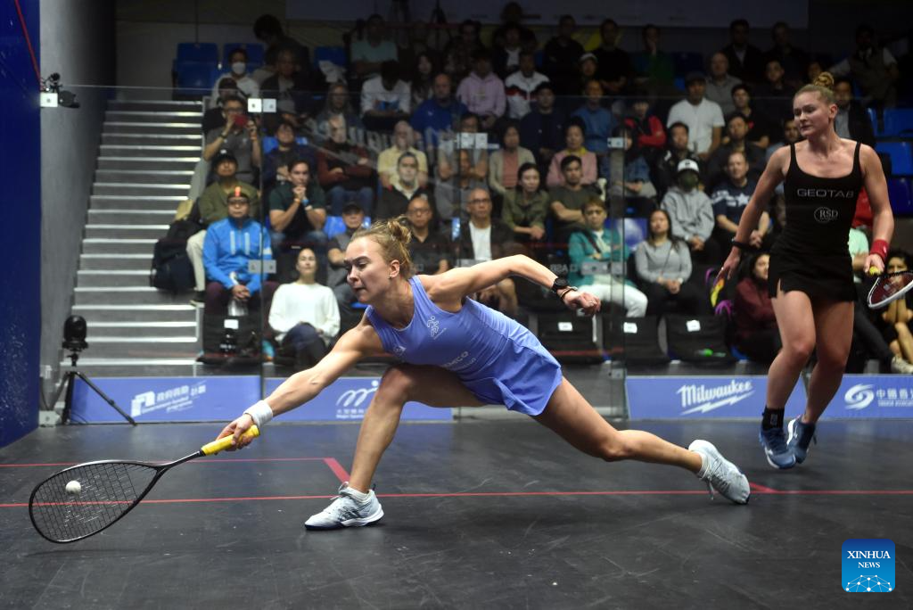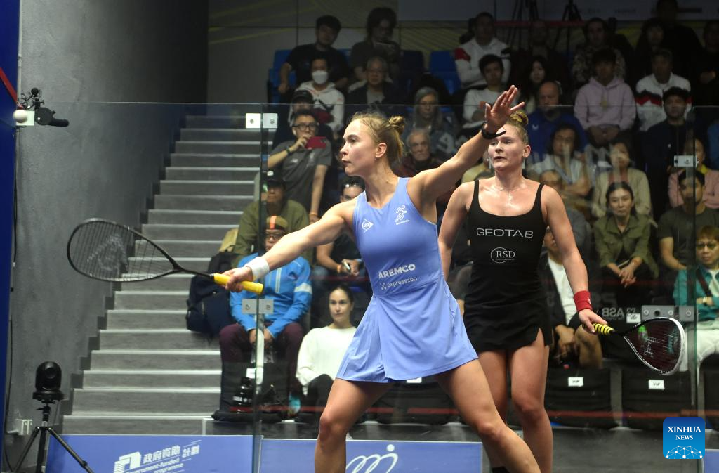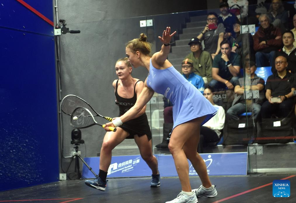 Tinne Gilis (R) of Belgium and Hollie Naughton of Canada compete during their women's Round 2 match at the 2024 Hong Kong Squash Open in Hong Kong, south China, Dec. 4, 2024. (Photo by Lo Ping Fai/Xinhua)
