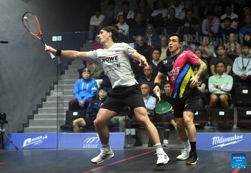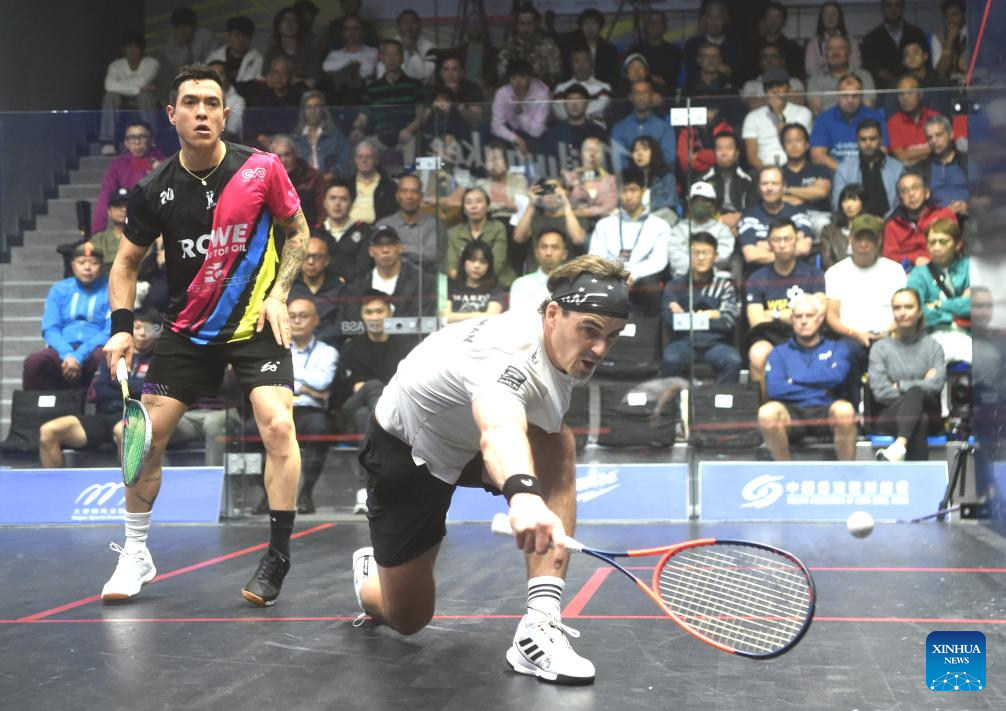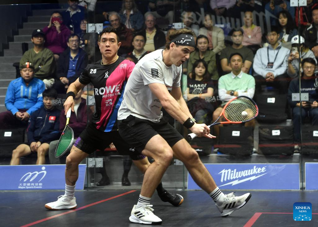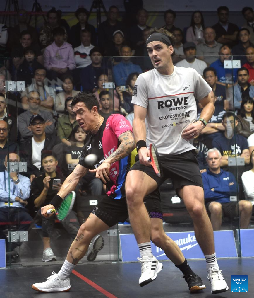 Paul Coll (L) of New Zealand and Miguel Rodriguez of Columbia compete during their men's Round 2 match at the 2024 Hong Kong Squash Open in Hong Kong, south China, Dec. 4, 2024. (Photo by Lo Ping Fai/Xinhua)