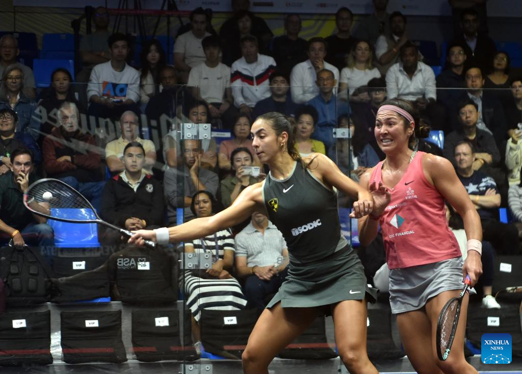 Hania El Hammamy (R) of Egypt and Amanda Sobhy of the United States compete during their women's Round 2 match at the 2024 Hong Kong Squash Open in Hong Kong, south China, Dec. 4, 2024. (Photo by Lo Ping Fai/Xinhua)