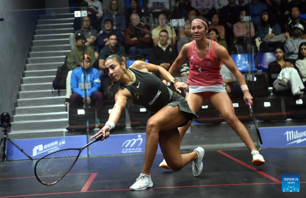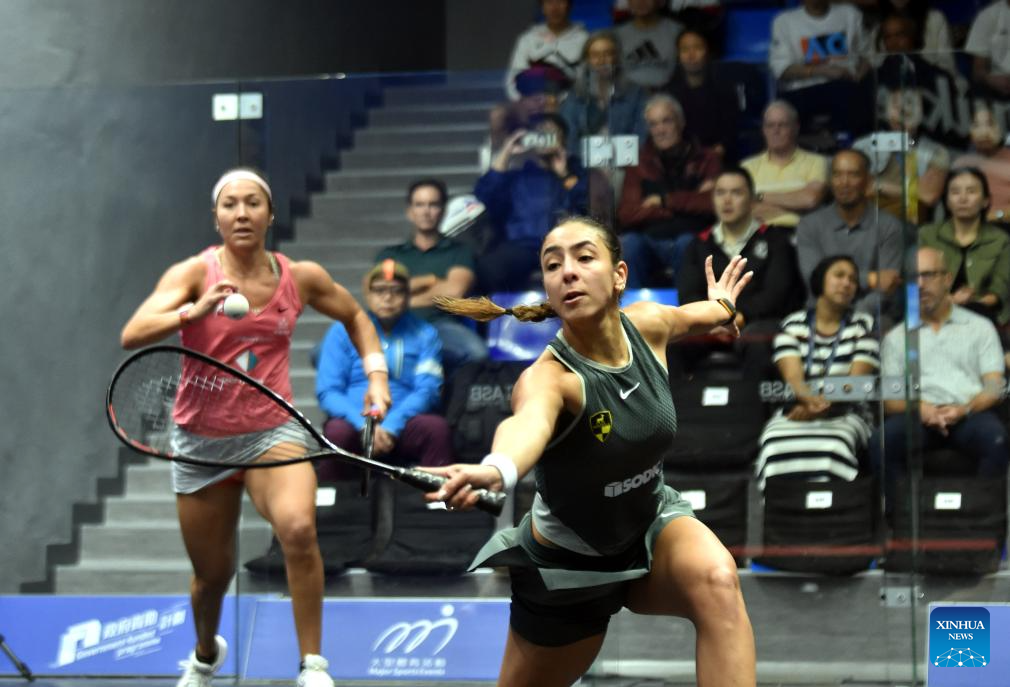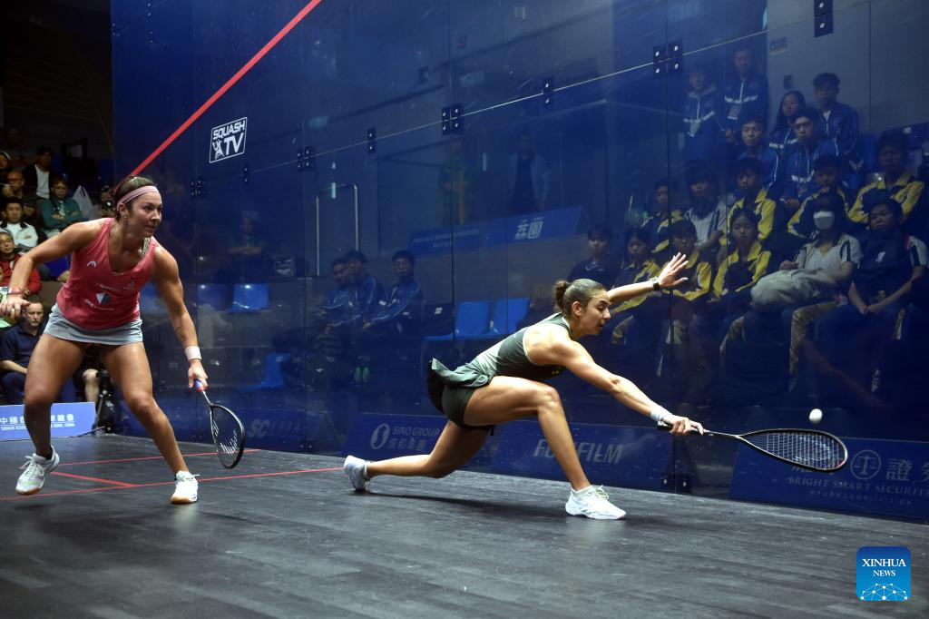 Hania El Hammamy (L) of Egypt and Amanda Sobhy of the United States compete during their women's Round 2 match at the 2024 Hong Kong Squash Open in Hong Kong, south China, Dec. 4, 2024. (Photo by Lo Ping Fai/Xinhua)