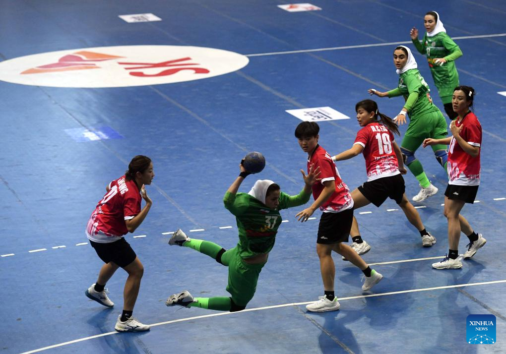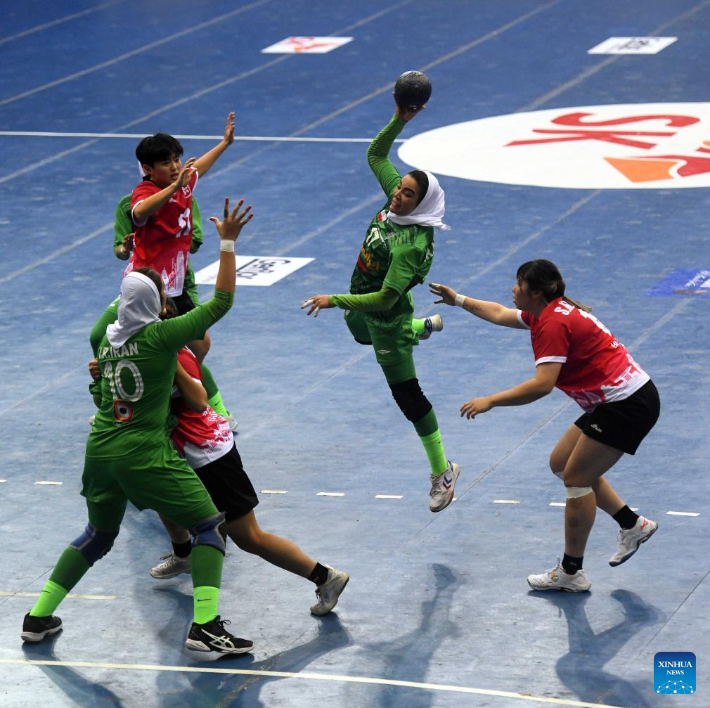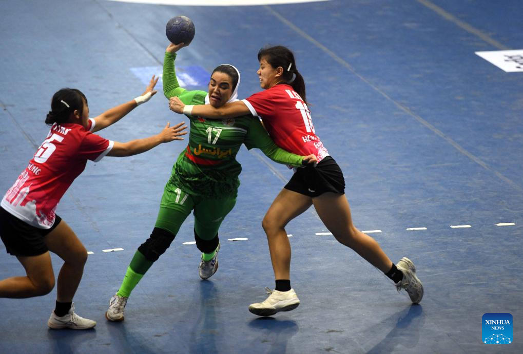 Mi Vatan Parast Tootoonsiz (2nd R) of Iran competes during the match between Iran and China's Hong Kong at the Asian Women's Handball Championship in New Delhi, India, Dec. 6, 2024. (Xinhua/Str)