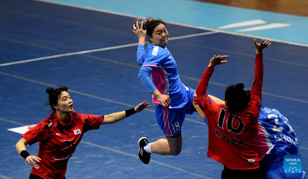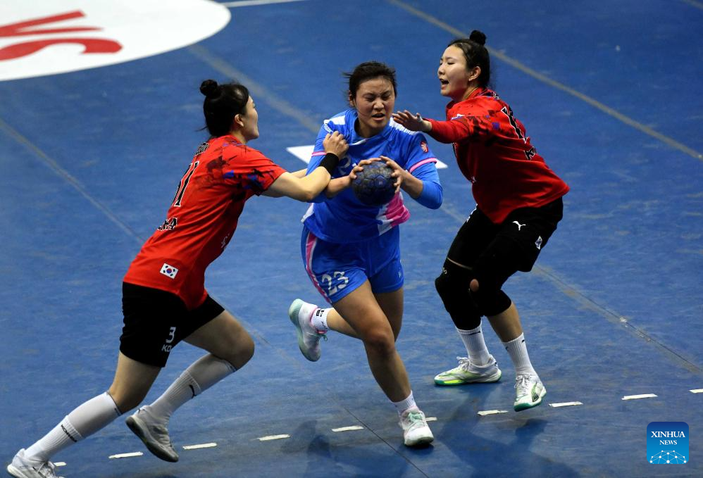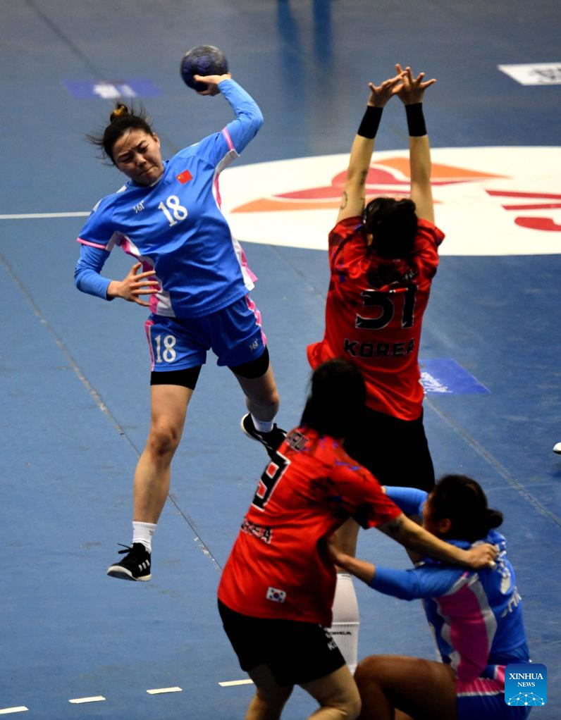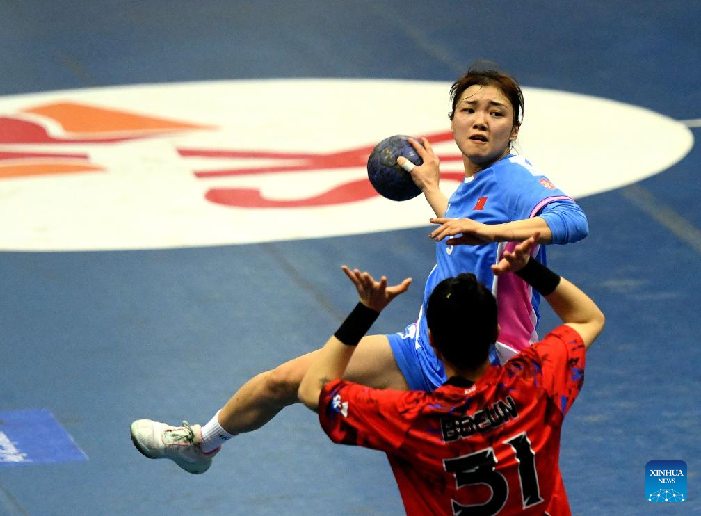 Li Yuanmeng (C) of China competes during the match between China and South Korea at the Asian Women's Handball Championship in New Delhi, India, Dec. 6, 2024. (Xinhua/Str)