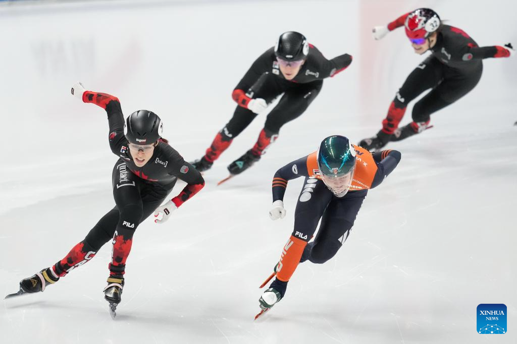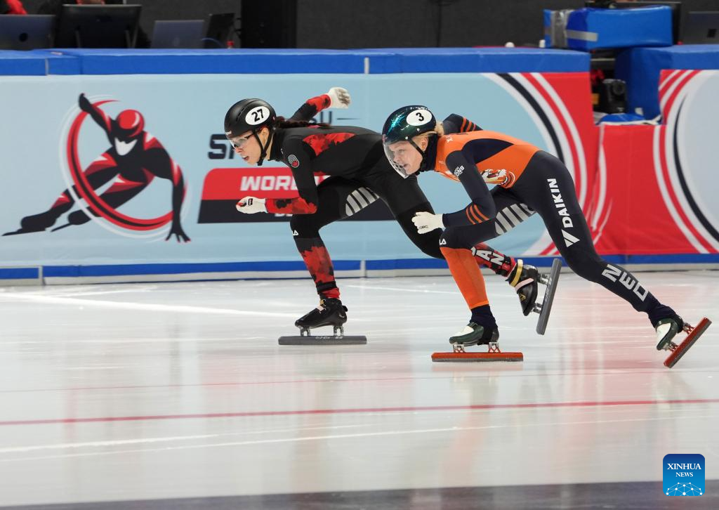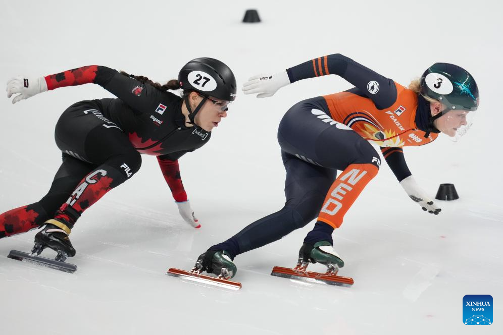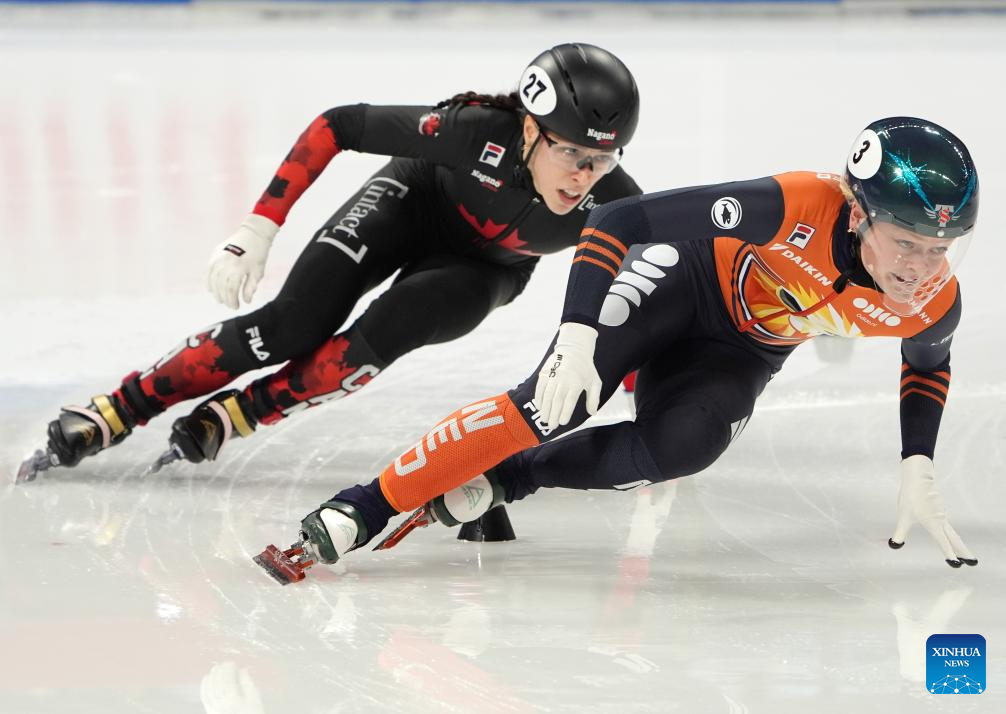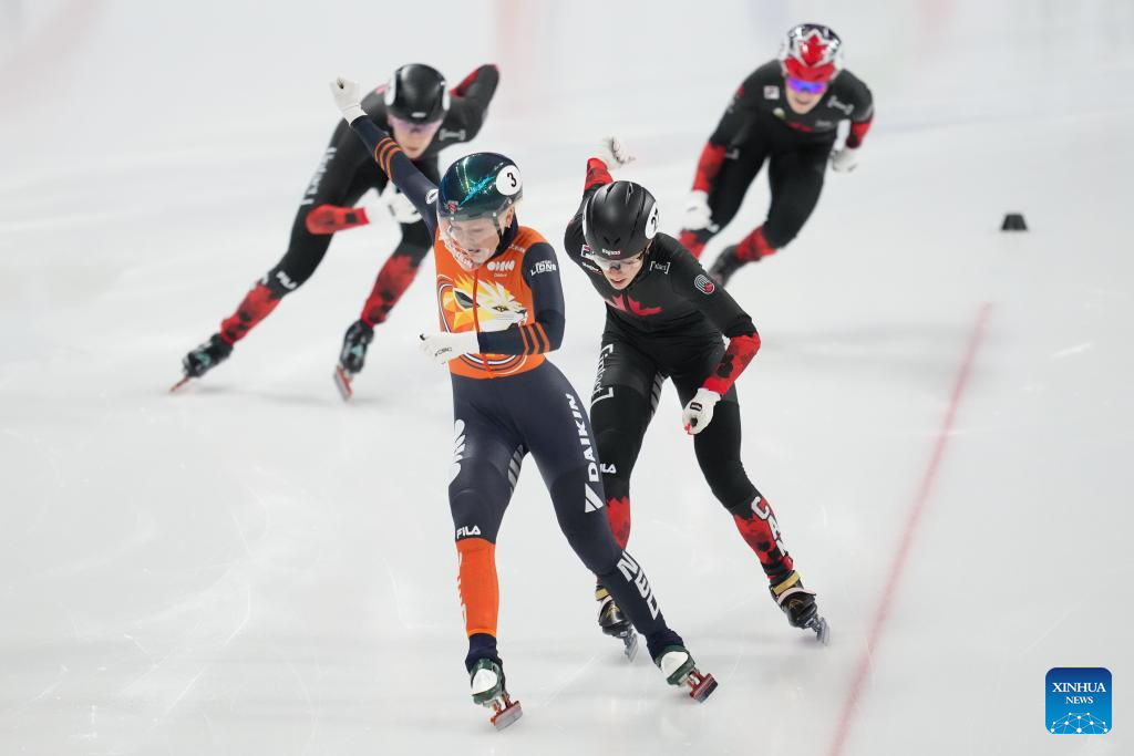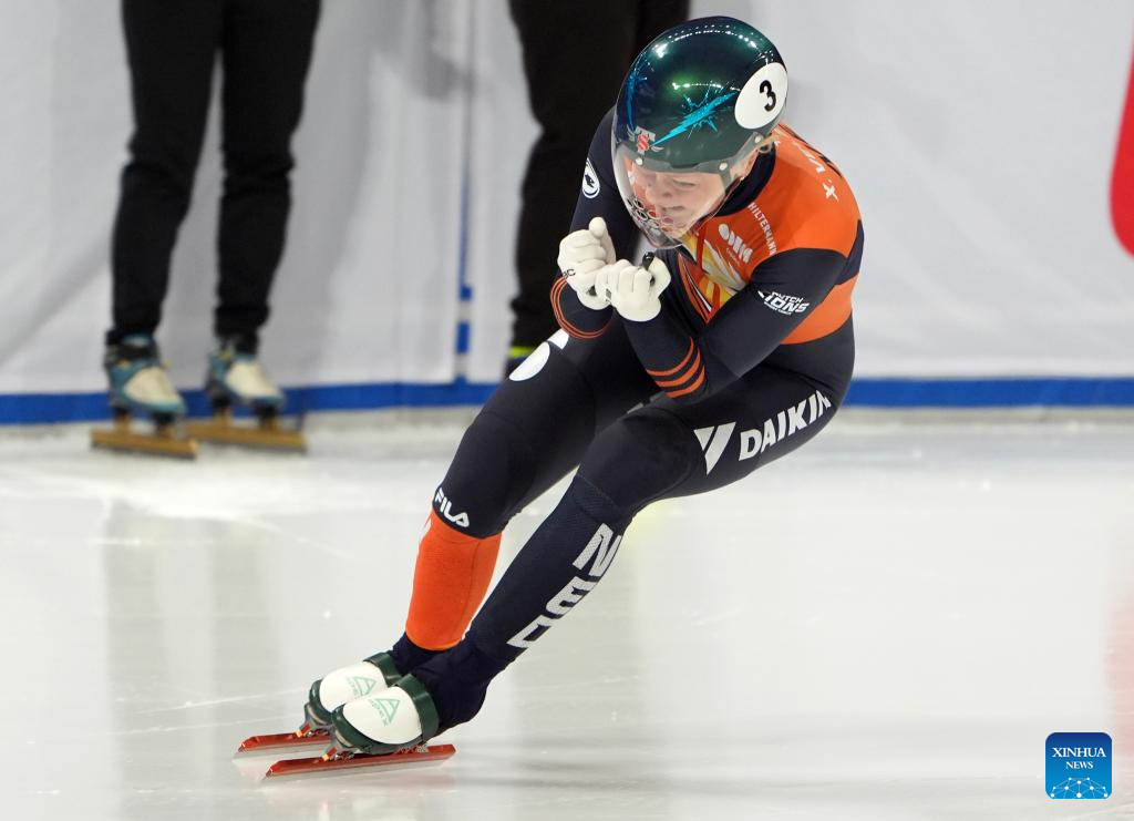 Xandra Velzeboer (Front R) of the Netherlands competes during the women's 500m group A final at the ISU Short Track World Tour in Beijing, capital of China, on Dec. 8, 2024. (Xinhua/Ju Huanzong)