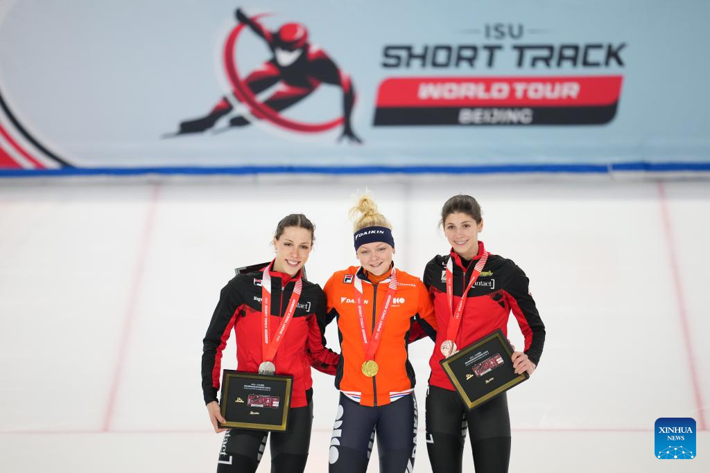 Gold medalist Xandra Velzeboer (C) of the Netherlands, silver medalist Florence Brunelle (L) of Canada, bronze medalist Rikki Doak of Canada pose during the awarding ceremony of the women's 500m group A final at the ISU Short Track World Tour in Beijing, capital of China, on Dec. 8, 2024. (Xinhua/Ju Huanzong)