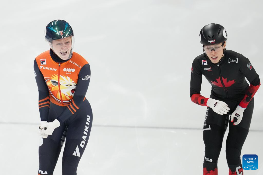 Xandra Velzeboer (R) of the Netherlands competes during the women's 500m group A final at the ISU Short Track World Tour in Beijing, capital of China, on Dec. 8, 2024. (Xinhua/Ju Huanzong)