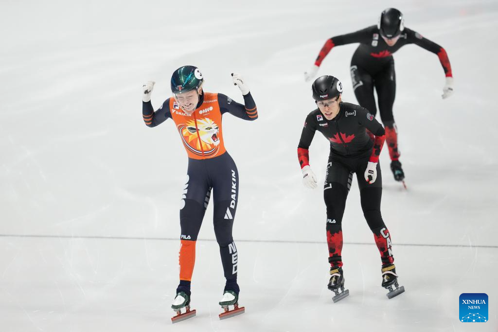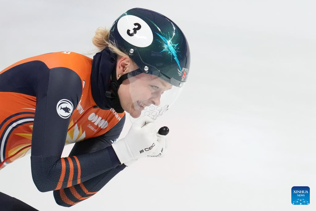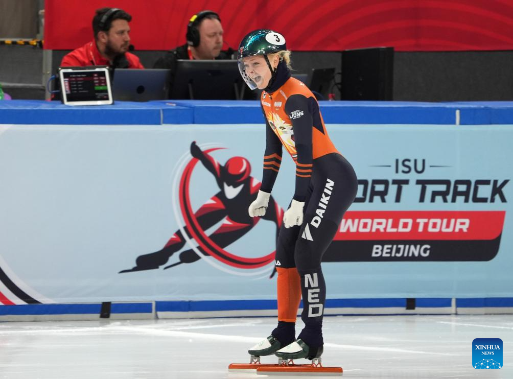 Xandra Velzeboer of the Netherlands celebrates after winning the women's 500m group A final at the ISU Short Track World Tour in Beijing, capital of China, on Dec. 8, 2024. (Xinhua/Ju Huanzong)