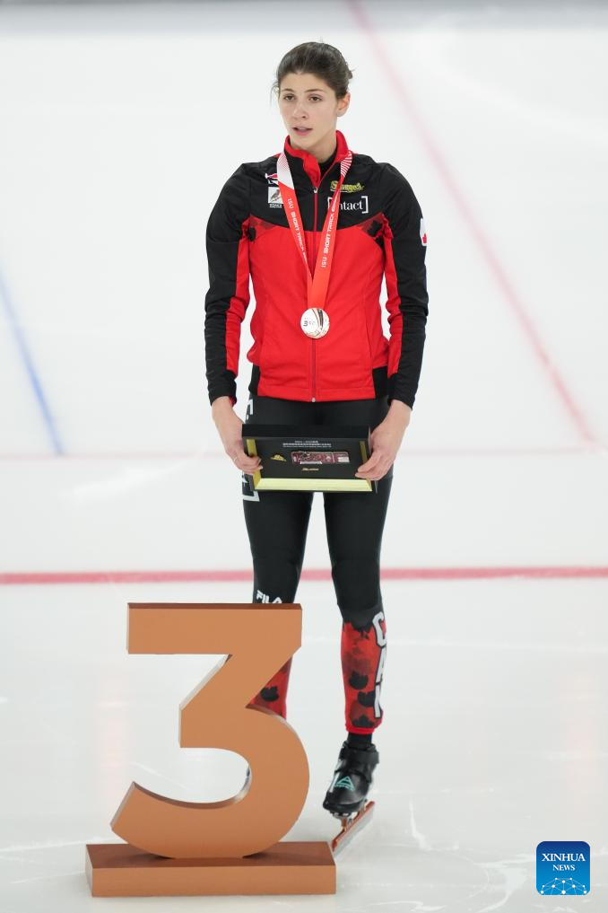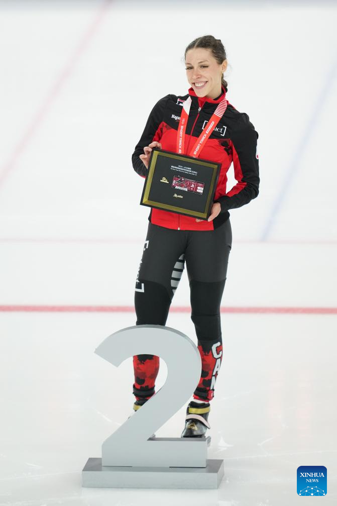 Silver medalist Florence Brunelle of Canada poses during the awarding ceremony of the women's 500m group A final at the ISU Short Track World Tour in Beijing, capital of China, on Dec. 8, 2024. (Xinhua/Ju Huanzong)