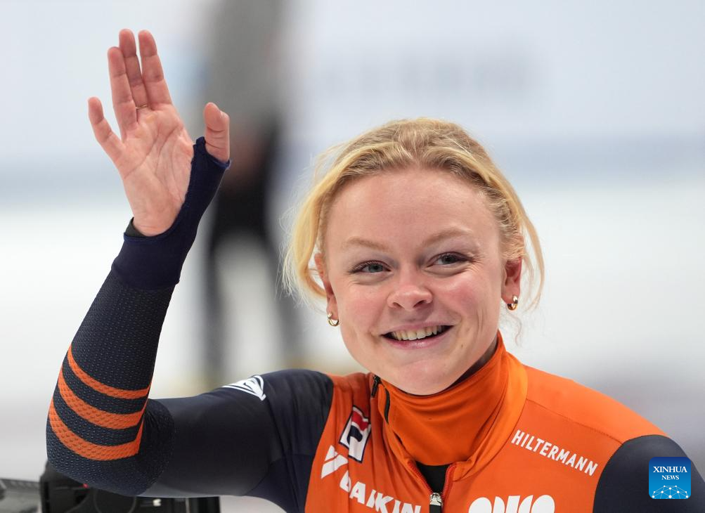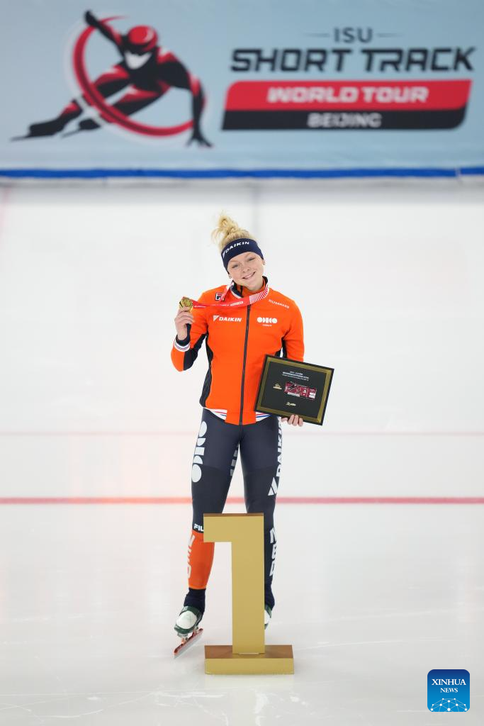 Gold medalist Xandra Velzeboer of the Netherlands poses during the awarding ceremony of the women's 500m group A final at the ISU Short Track World Tour in Beijing, capital of China, on Dec. 8, 2024. (Xinhua/Ju Huanzong)