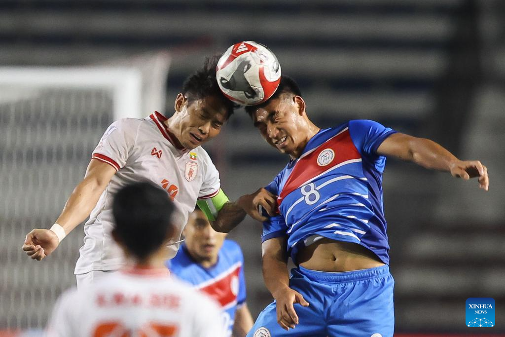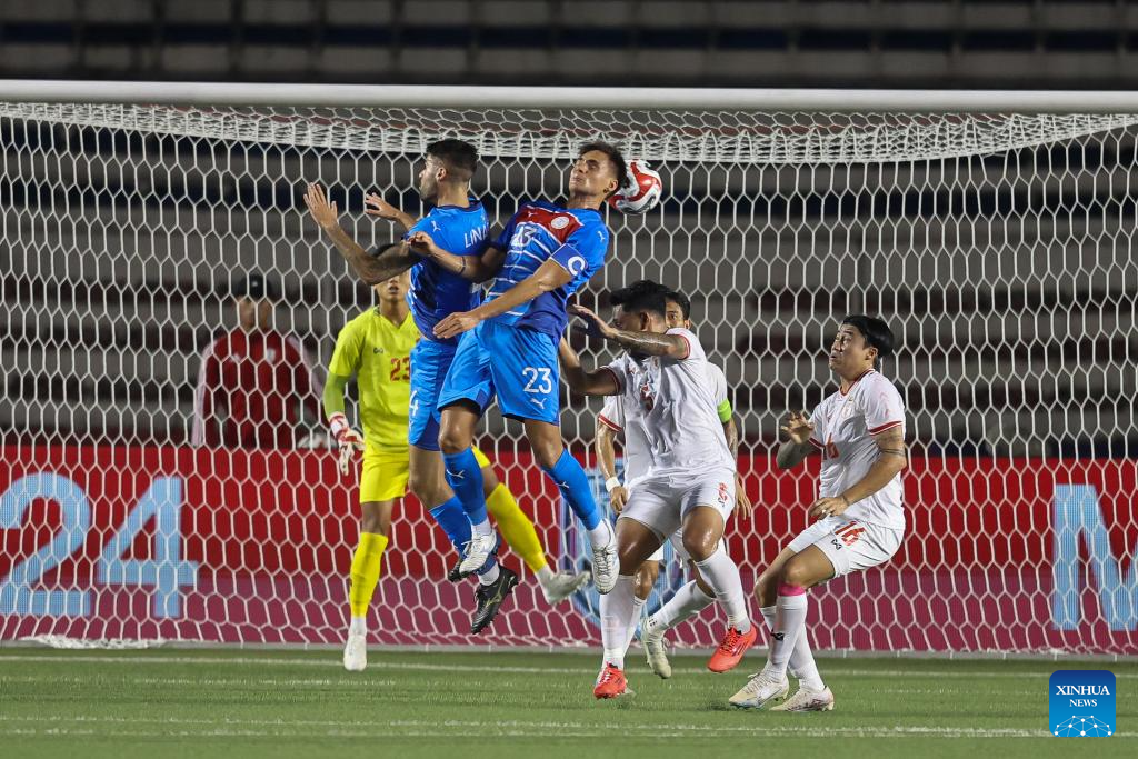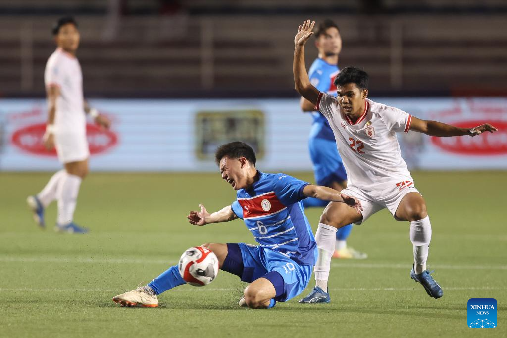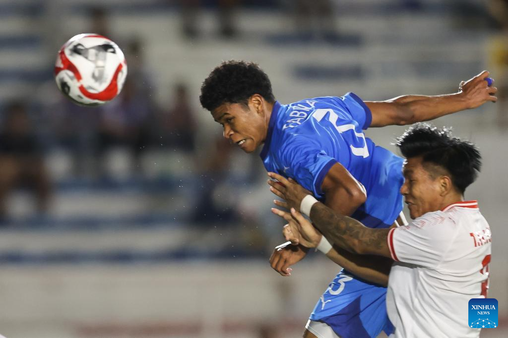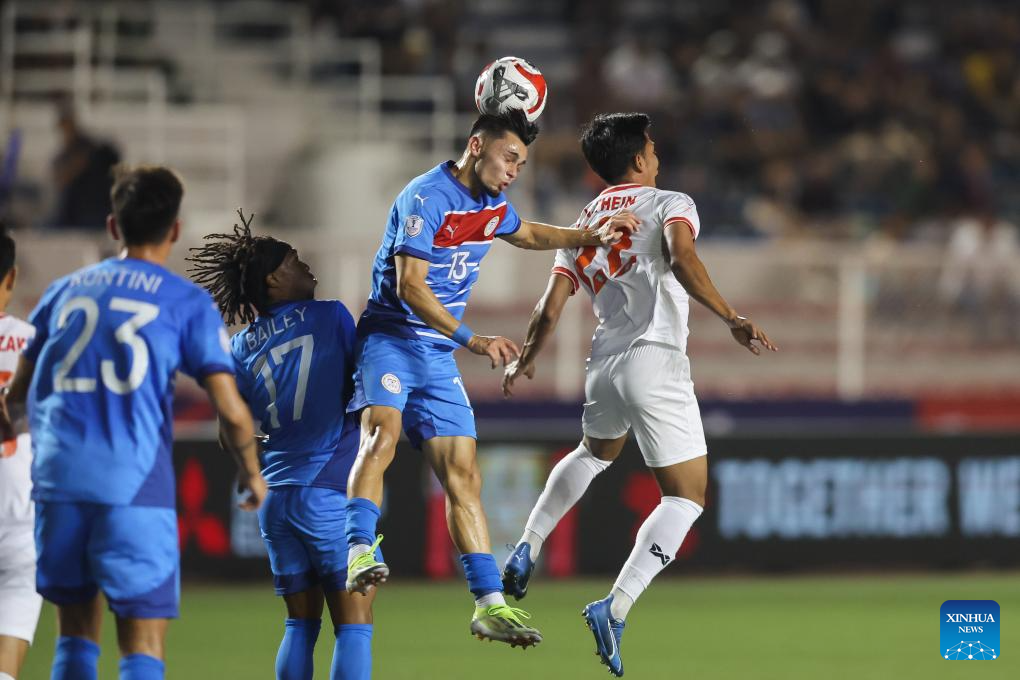 Alex James Weathers Monis (2nd R) of the Philippines competes against Zaw Win Thein (1st R) of Myanmar during the group B match between the Philippines and Myanmar at the 2024 ASEAN Championship in Manila, the Philippines, on Dec. 12, 2024. (Xinhua/Rouelle Umali)