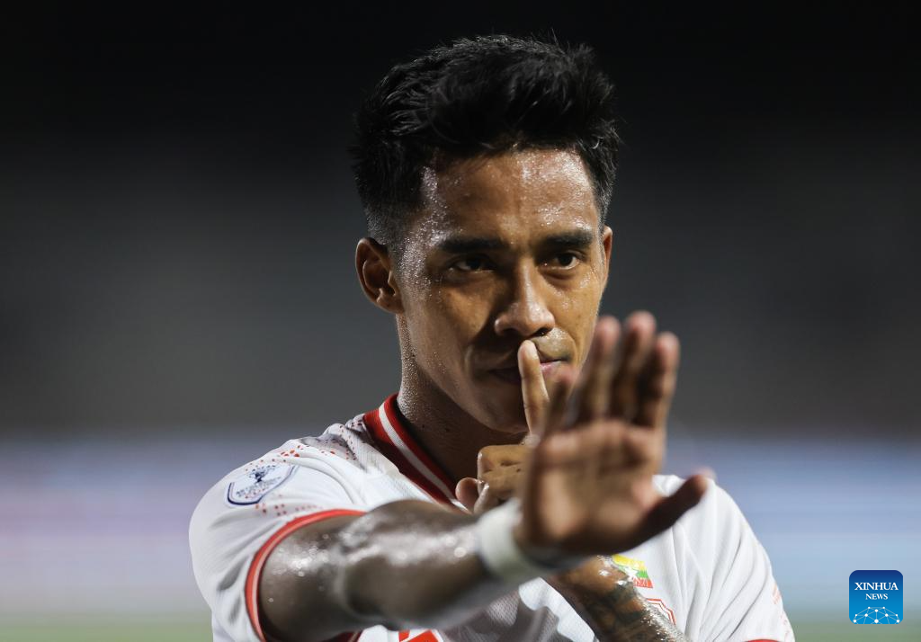 Mg Mg Lwin of Myanmar celebrates after scoring a goal during the group B match between the Philippines and Myanmar at the 2024 ASEAN Championship in Manila, the Philippines, on Dec. 12, 2024. (Xinhua/Rouelle Umali)