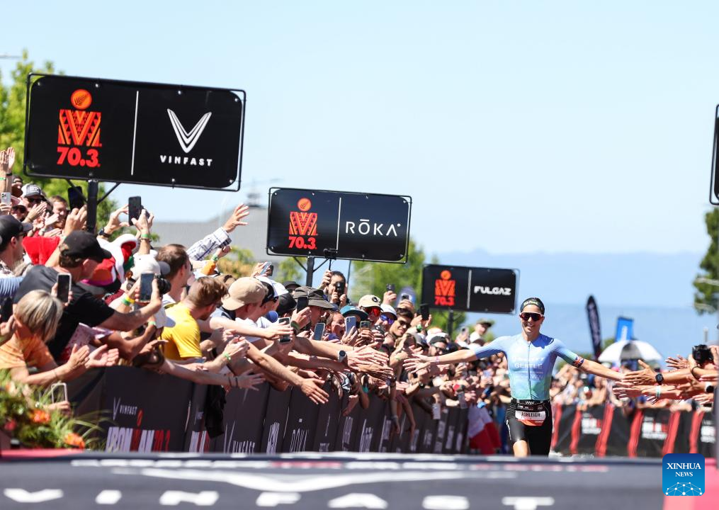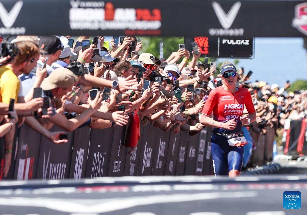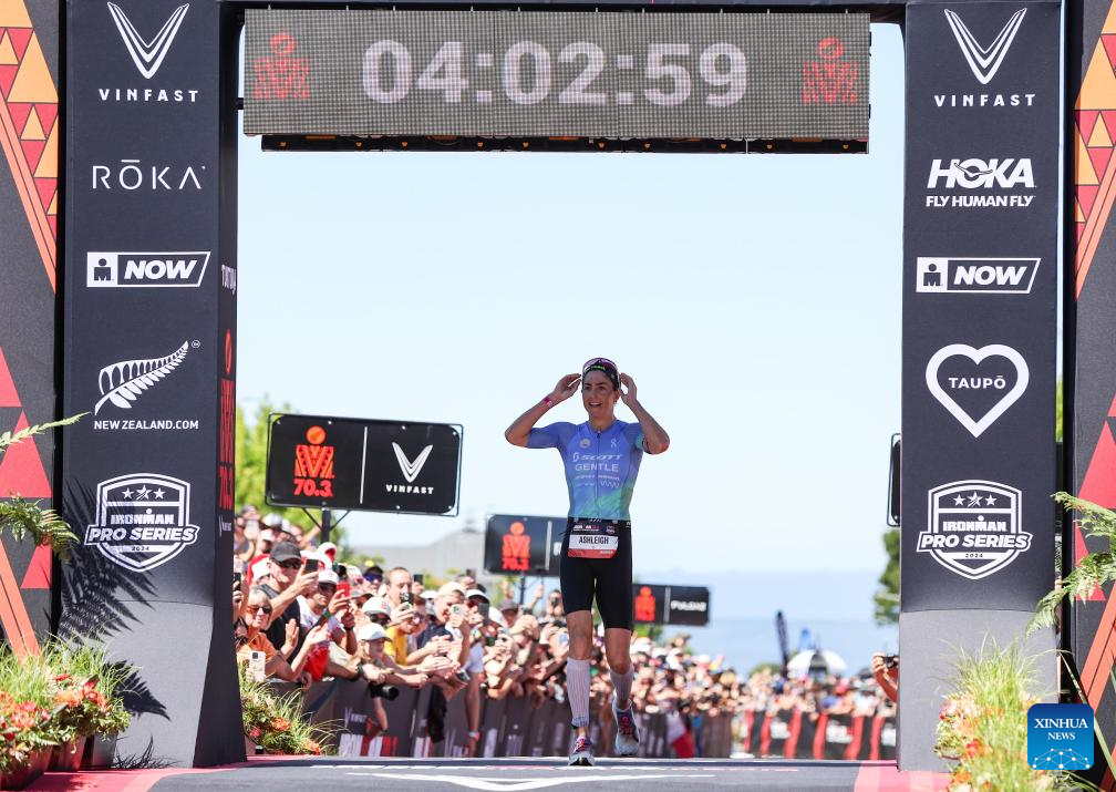 Ashleigh Gentle of Australia reaches the finish line in the women's event during the 2024 Ironman 70.3 World Championship held in Taupo, New Zealand, Dec. 14, 2024. (Xinhua/Long Lei)