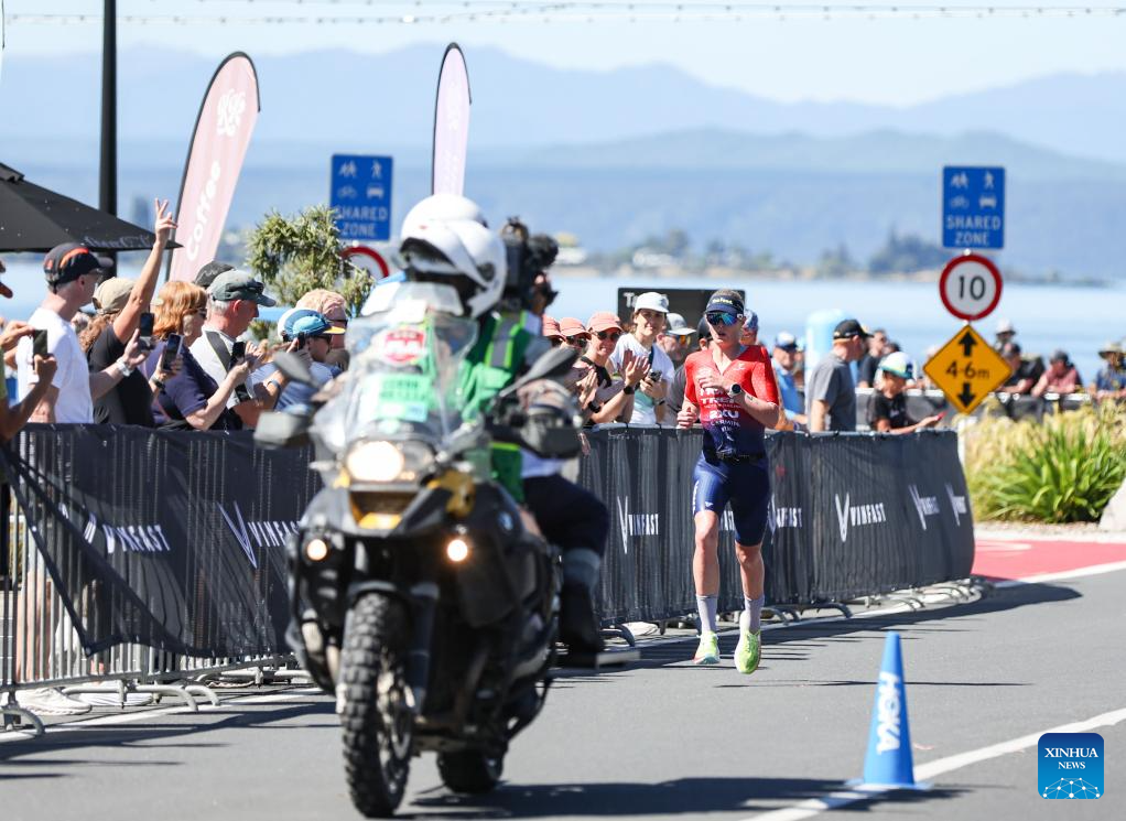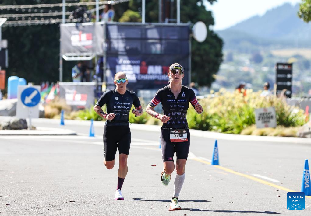 Taylor Knibb (C) of the United States reaches the finish line in the women's event during the 2024 Ironman 70.3 World Championship held in Taupo, New Zealand, Dec. 14, 2024. (Xinhua/Long Lei)