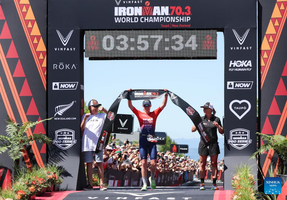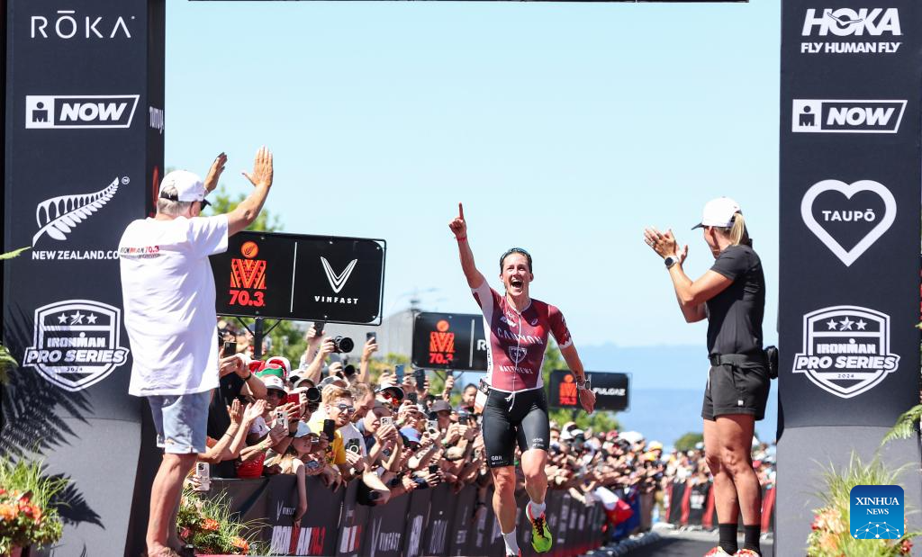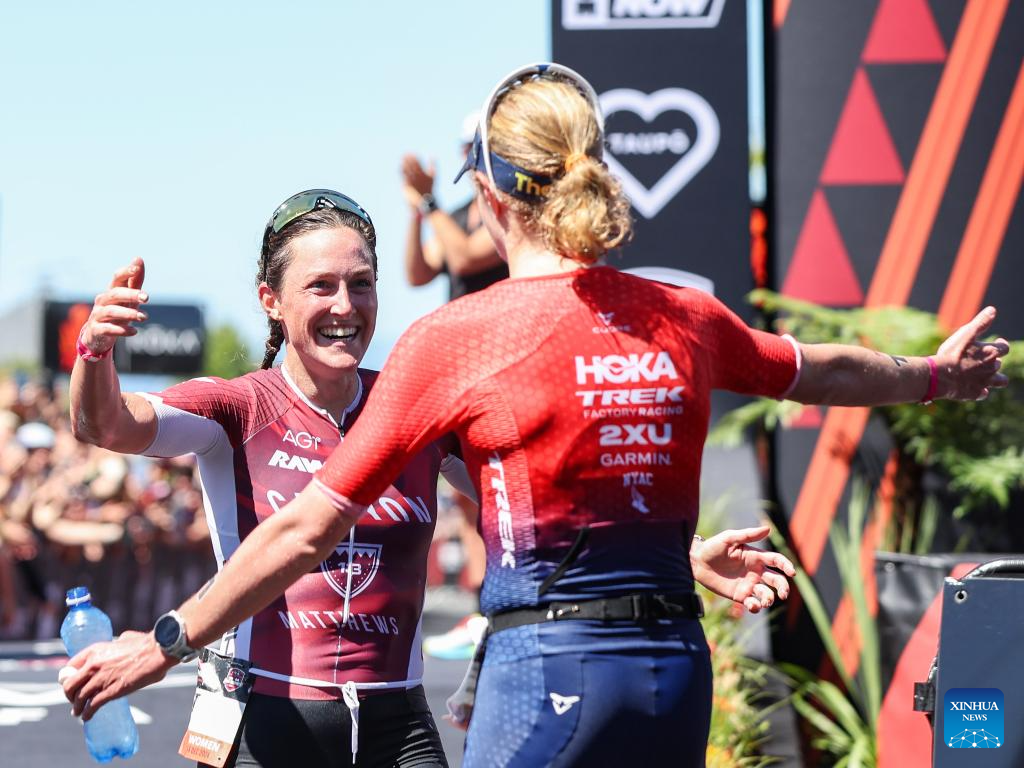 Kat Matthews (C) of Britain reaches the finish line in the women's event during the 2024 Ironman 70.3 World Championship held in Taupo, New Zealand, Dec. 14, 2024. (Xinhua/Long Lei)