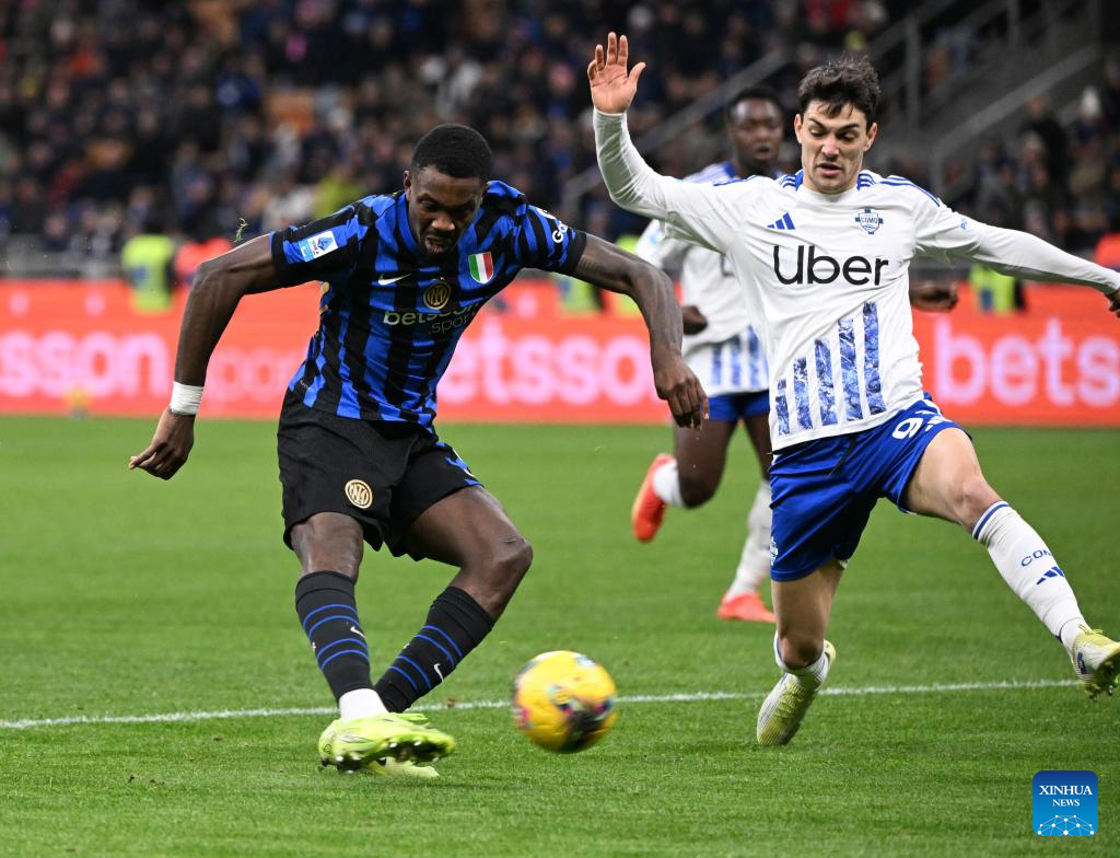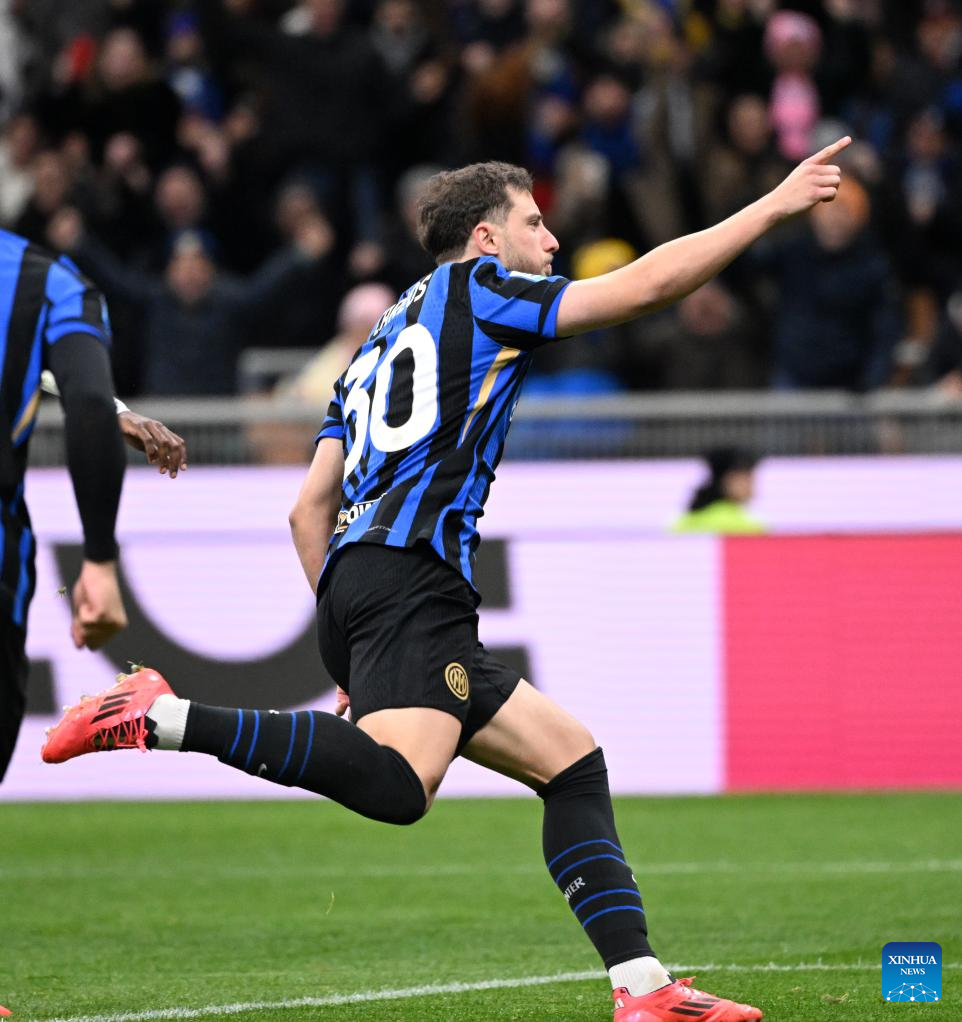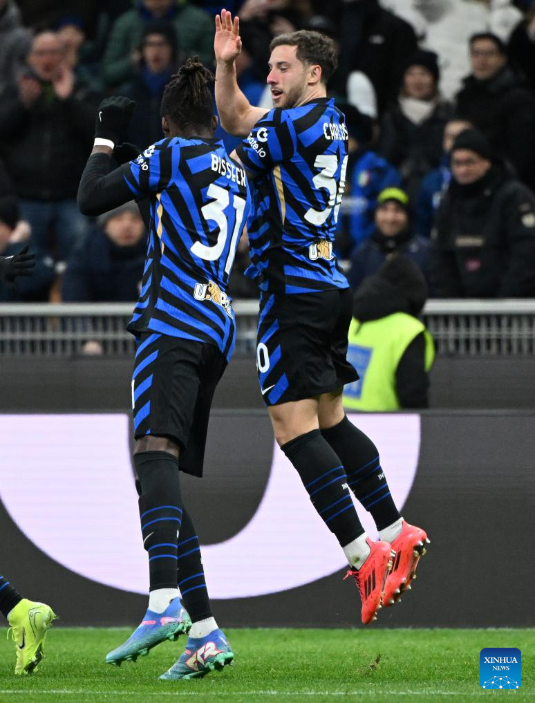 Inter Milan's Carlo Augusto celebrates his goal during a Serie A football match between Inter Milan and Como in Milan, Italy, Dec. 23, 2024. (Photo by Alberto Lingria/Xinhua)