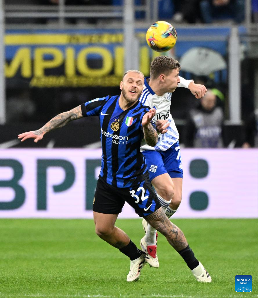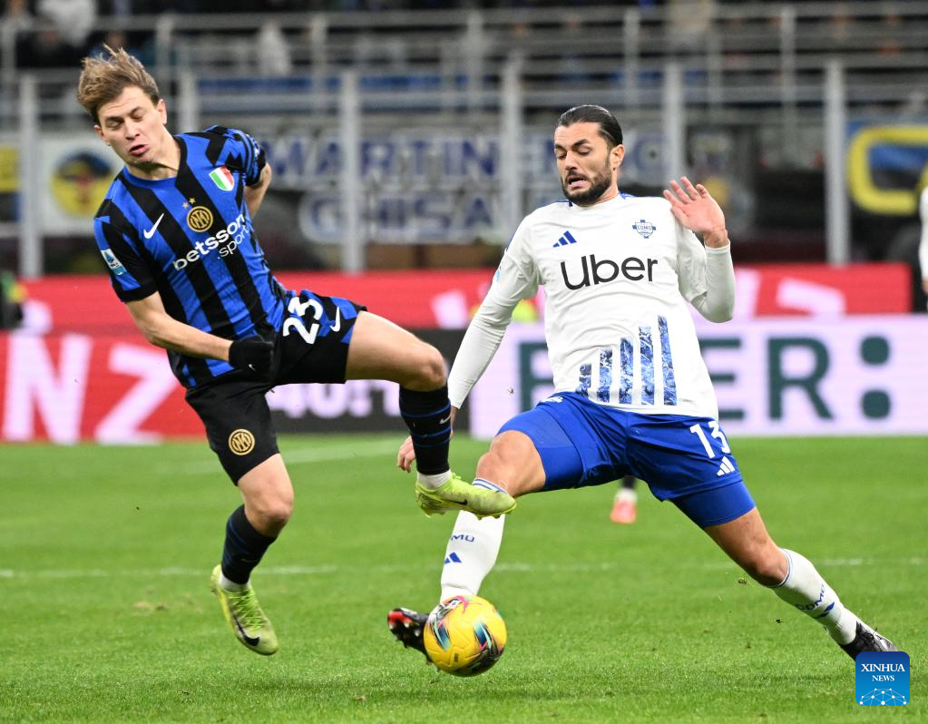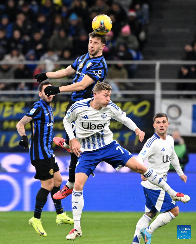 Inter Milan's Nicolo Barella (L) vies with Como's Alberto Dossena during a Serie A football match between Inter Milan and Como in Milan, Italy, Dec. 23, 2024. (Photo by Alberto Lingria/Xinhua)