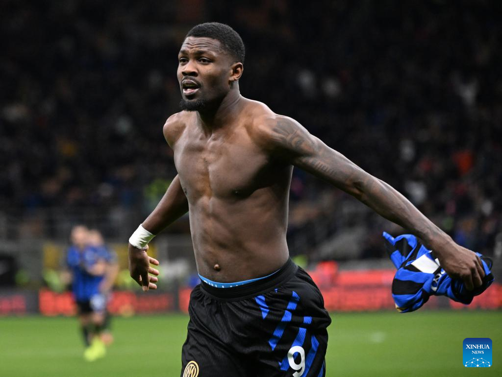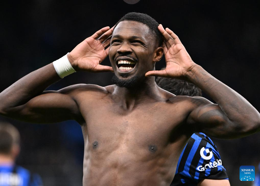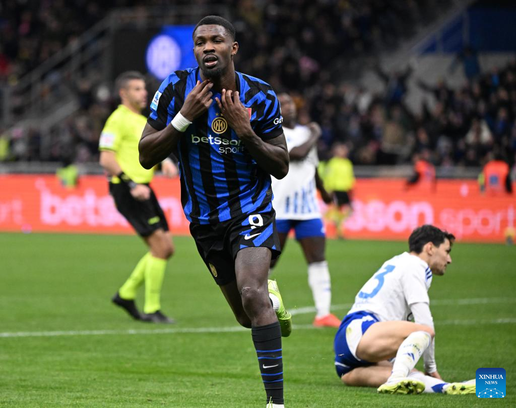 Inter Milan's Marcus Thuram celebrates his goal during a Serie A football match between Inter Milan and Como in Milan, Italy, Dec. 23, 2024. (Photo by Alberto Lingria/Xinhua)