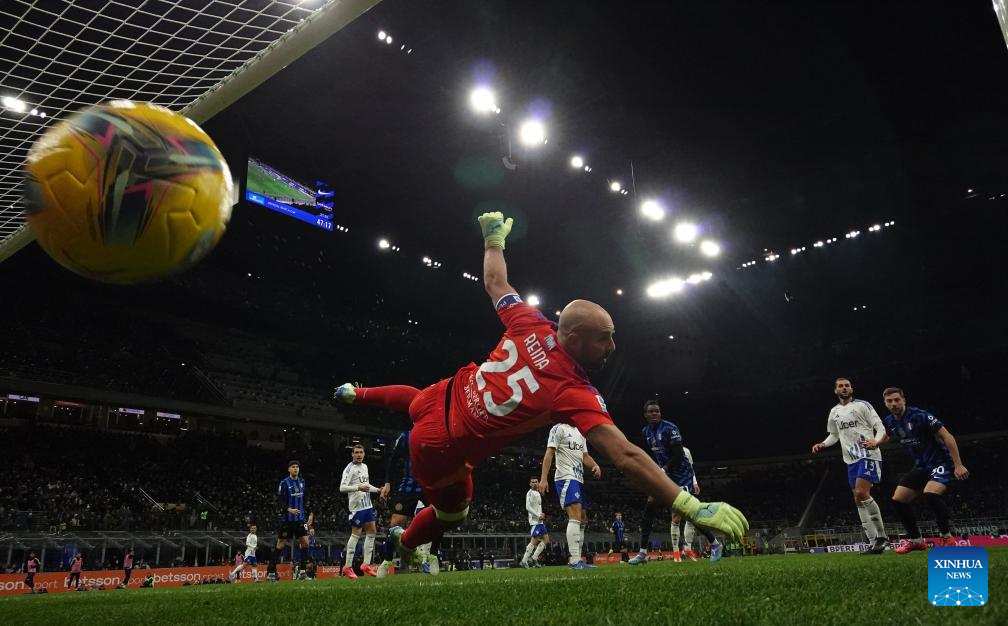 Como's goalkeeper Pepe Reina fails to save the goal of Inter Milan's Carlo Augusto (1st R) during a Serie A football match between Inter Milan and Como in Milan, Italy, Dec. 23, 2024. (Photo by Alberto Lingria/Xinhua)