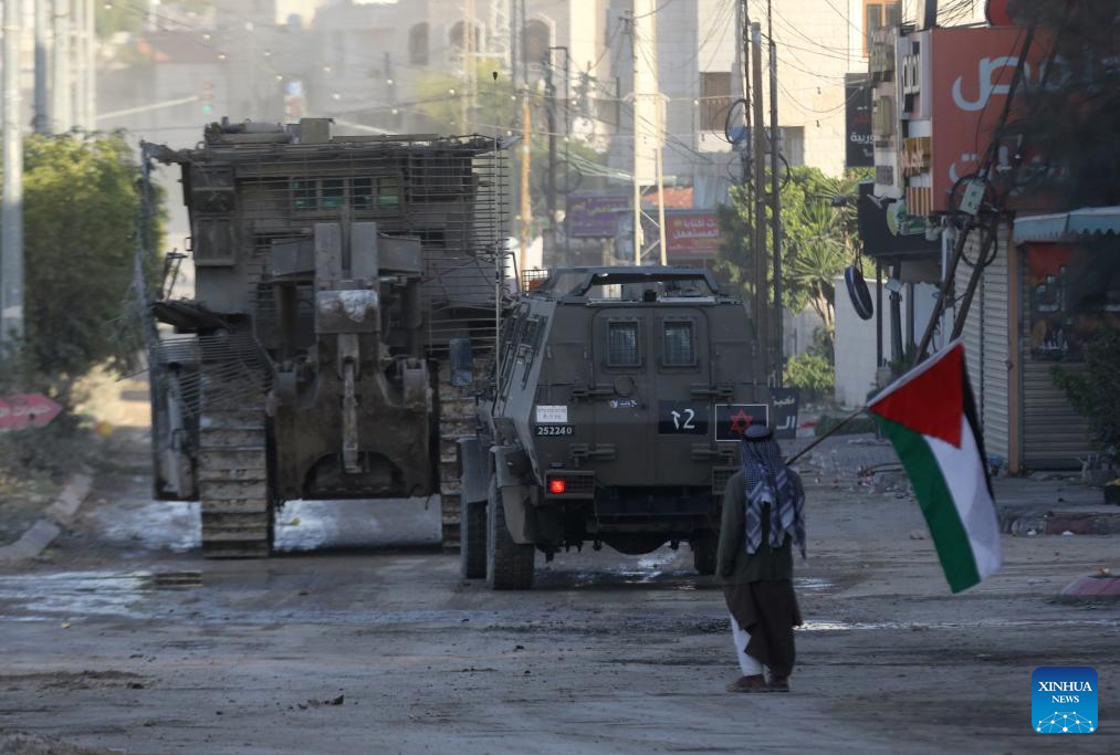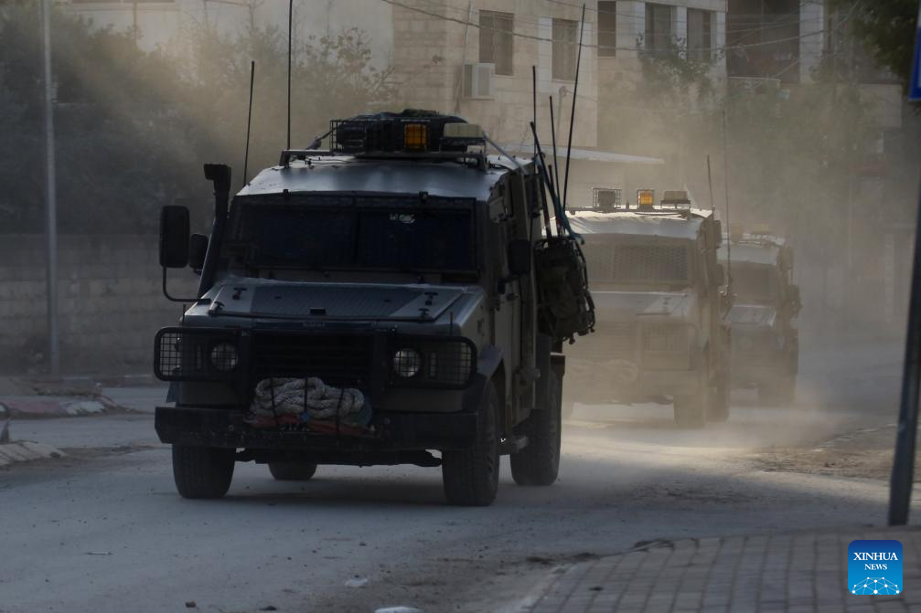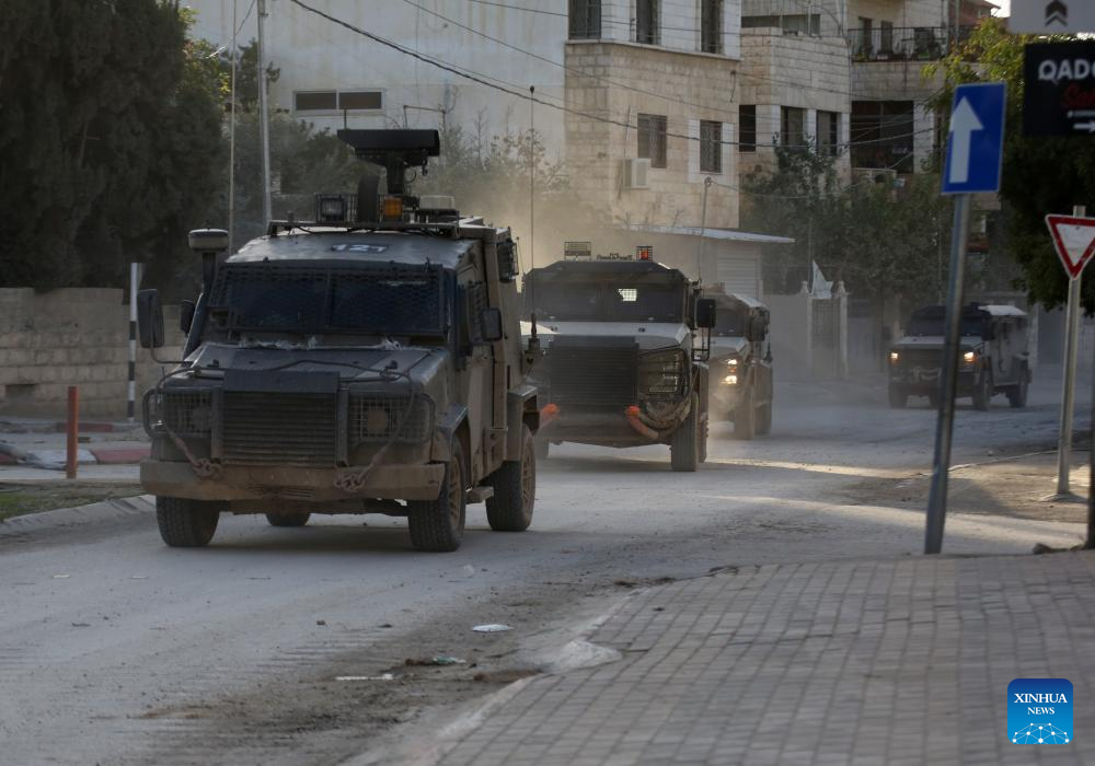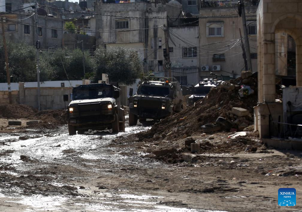 Israeli military vehicles are seen during an Israeli raid in the Tulkarm refugee camp in the northern West Bank, on Dec. 25, 2024. (Photo by Nidal Eshtayeh/Xinhua)