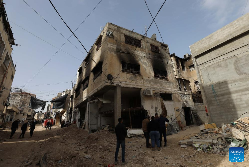 People are seen outside a building after an Israeli military operation in Tulkarm refugee camp in the northern West Bank, on Dec. 26, 2024. The Israeli army has been carrying out a large-scale military operation since Tuesday in the Tulkarm and Nur Shams refugee camps. (Photo by Ayman Nobani/Xinhua)