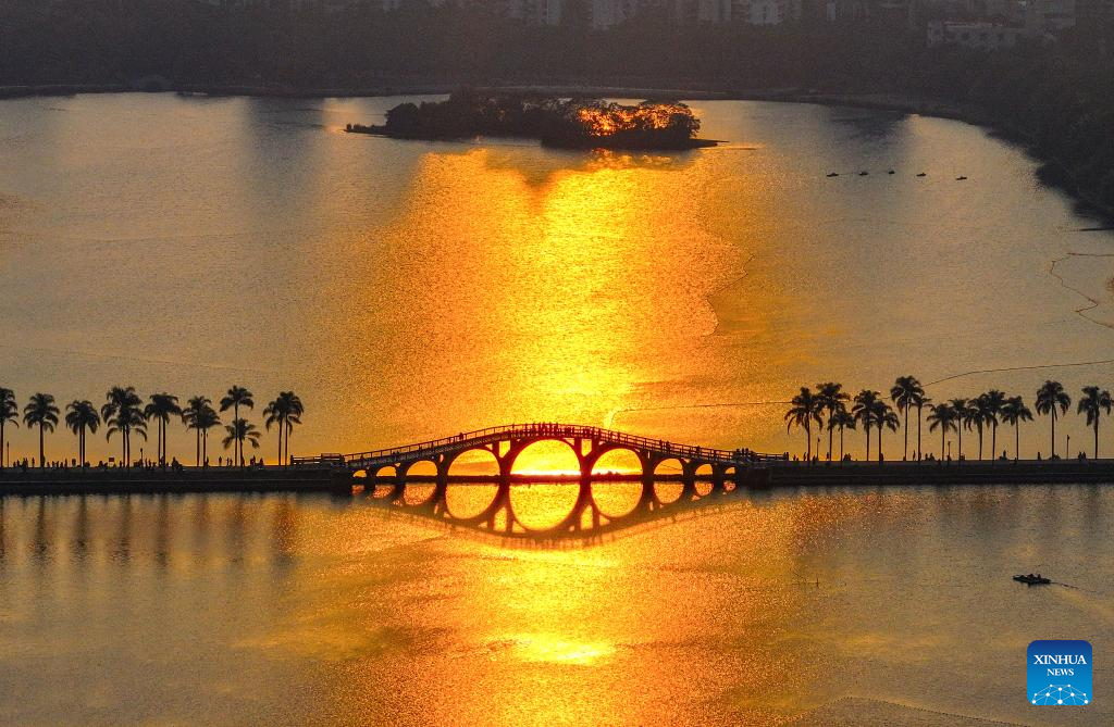 An aerial drone photo taken on Dec. 24, 2024 shows a view of Nanhu Park in Nanning, south China's Guangxi Zhuang Autonomous Region. (Photo by Yu Xiangquan/Xinhua)