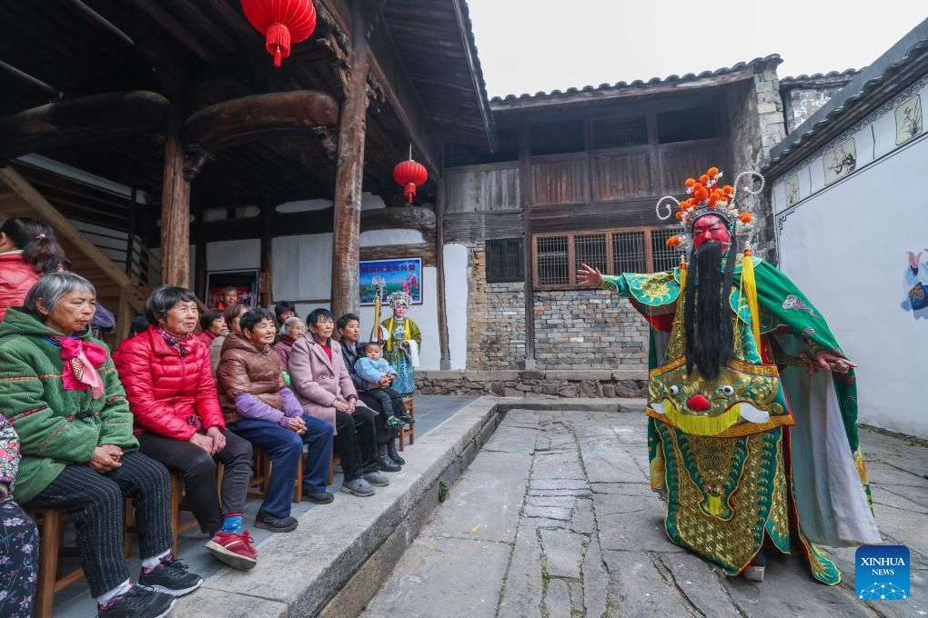 An artist from a local folk troupe of Wu Opera performs for villagers in Zhengdian Village of Lipu Town, Jinhua City, east China's Zhejiang Province on Dec. 25, 2024. A series of Wu Opera performances have been staged for villagers to welcome the New Year.