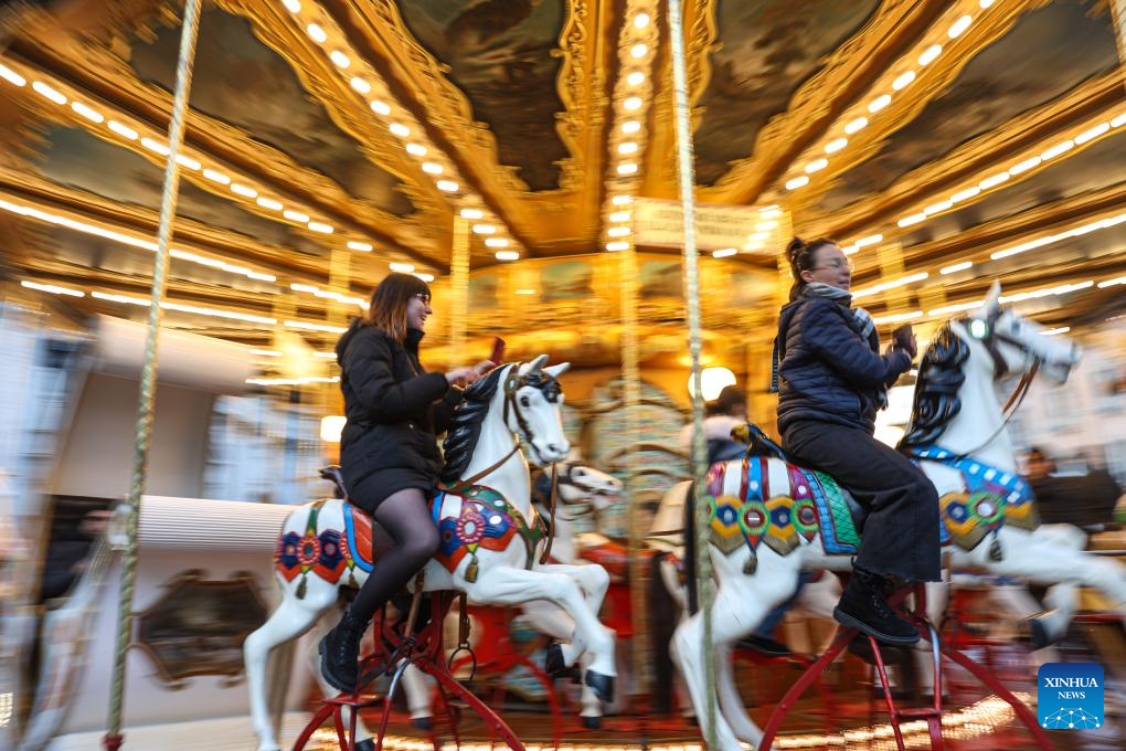 People ride a carousel at Piazza Navona in Rome, Italy, Dec. 24, 2024. (Xinhua/Li Jing)