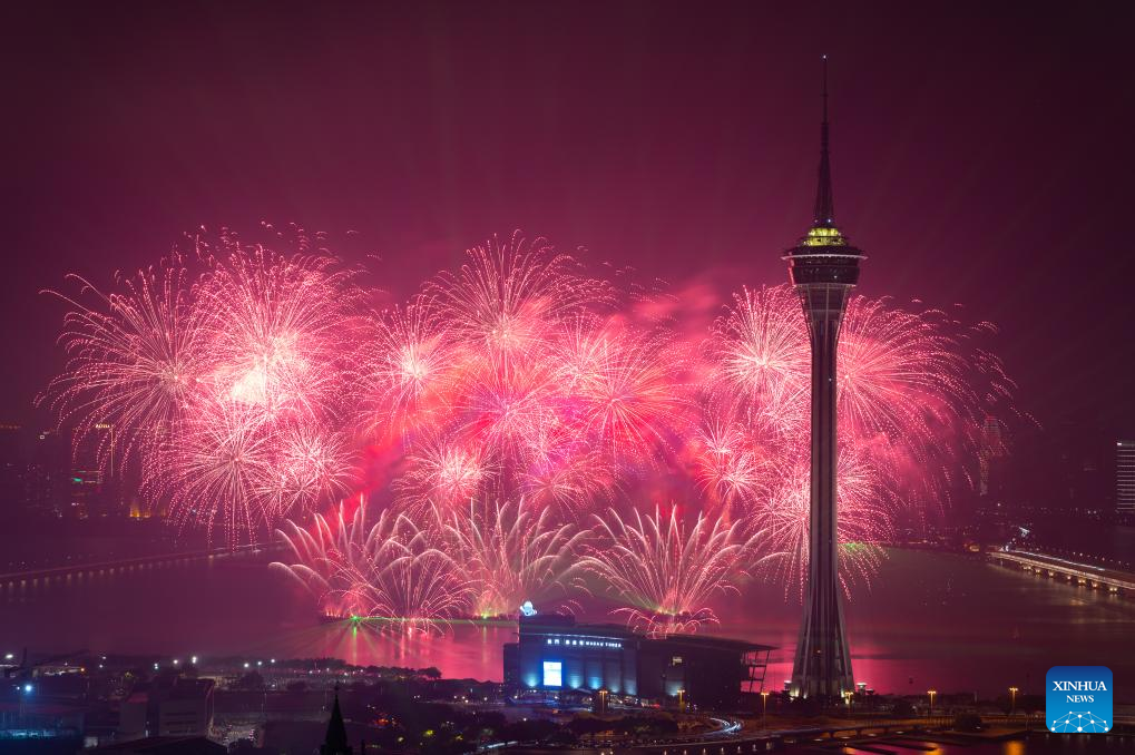 Fireworks illuminate the sky in Macao, south China, Dec. 25, 2024. Macao held a firework show to celebrate the 25th anniversary of Macao's return to the motherland. (Xinhua/Cheong Kam Ka)