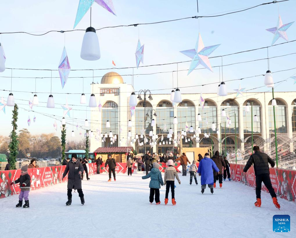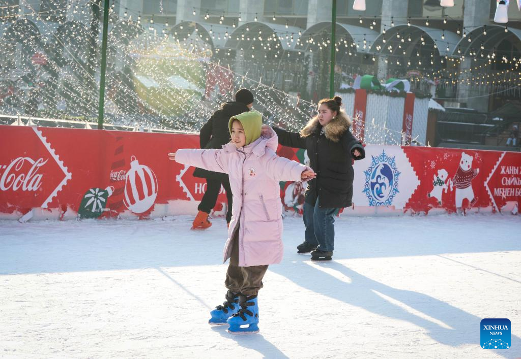 People skate at Ala Too Square during a New Year event in Bishkek, Kyrgyzstan, Dec. 23, 2024. (Photo by Roman Gainanov/Xinhua)