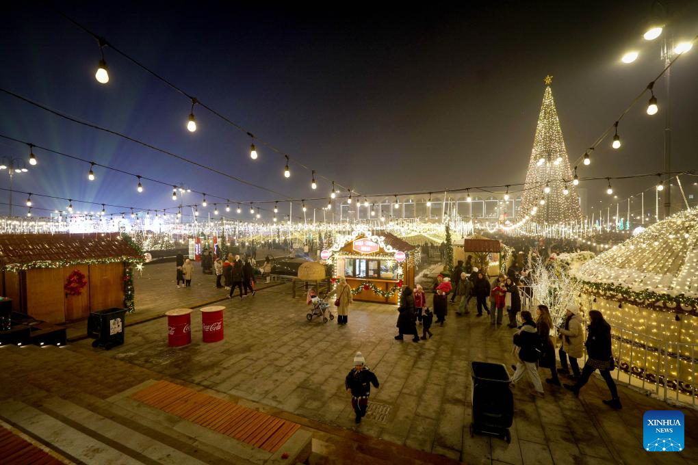 People visit a New Year market at Ala Too Square in Bishkek, Kyrgyzstan, Dec. 23, 2024. (Photo by Roman Gainanov/Xinhua)