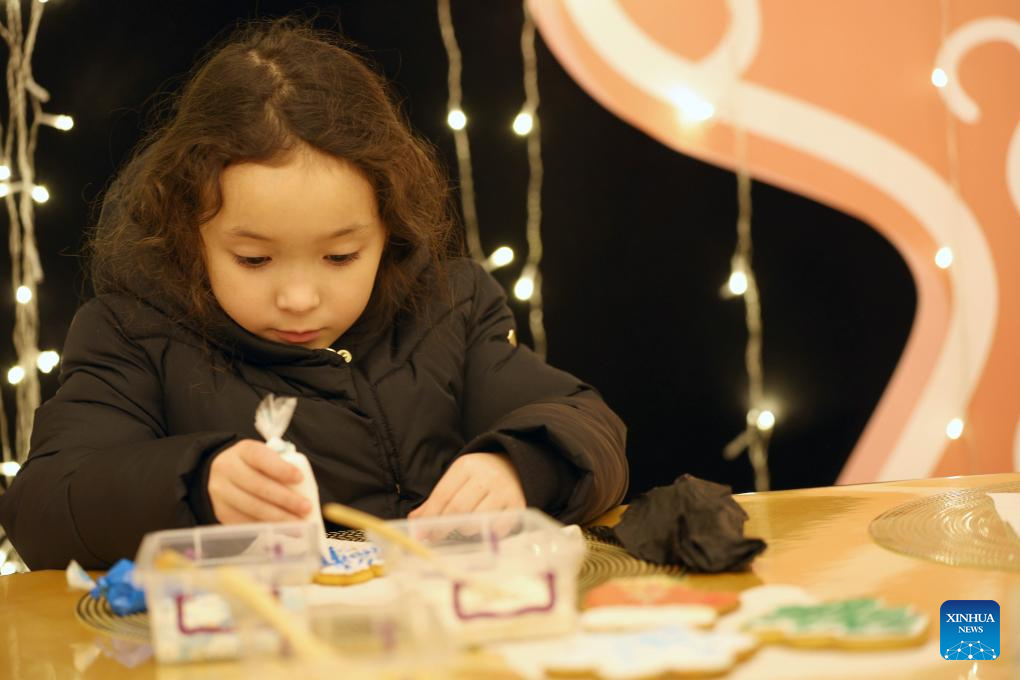 A girl does handwork during a New Year event in Bishkek, Kyrgyzstan, Dec. 25, 2024. (Photo by Roman Gainanov/Xinhua)