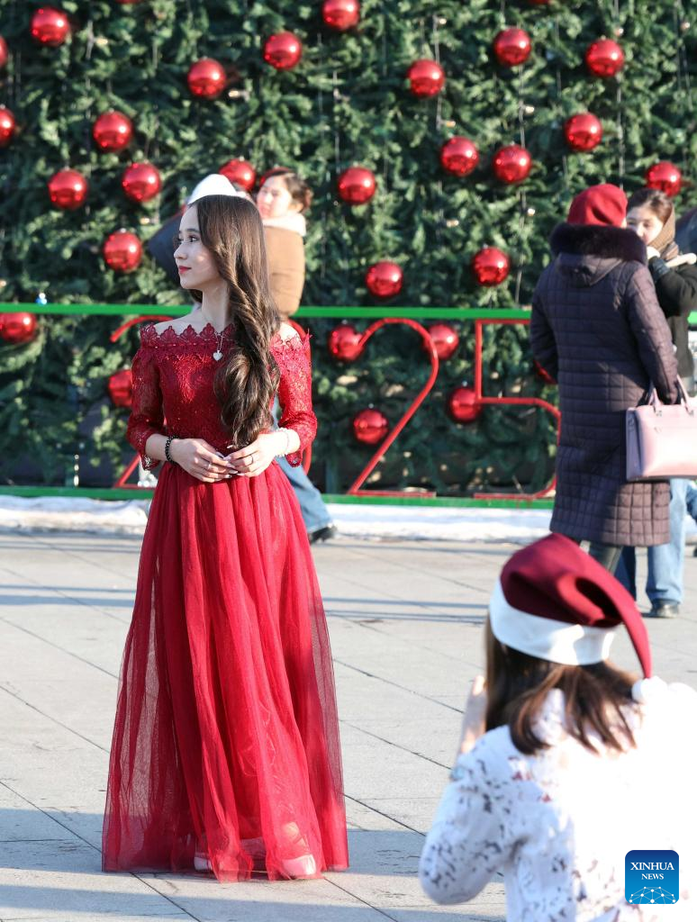 People visit Ala Too Square during a New Year event in Bishkek, Kyrgyzstan, Dec. 25, 2024. (Photo by Roman Gainanov/Xinhua)