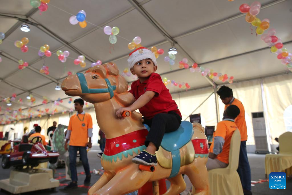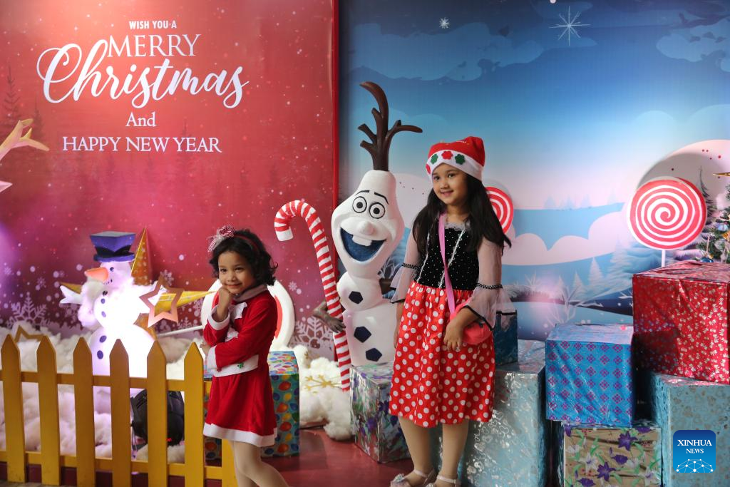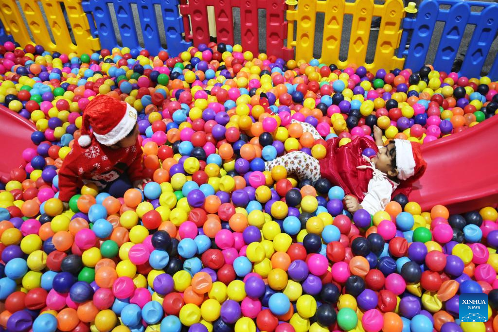 Children play inside a Christmas-themed area to celebrate the festival in a hotel in Dhaka, Bangladesh, Dec. 25, 2024. (Xinhua)