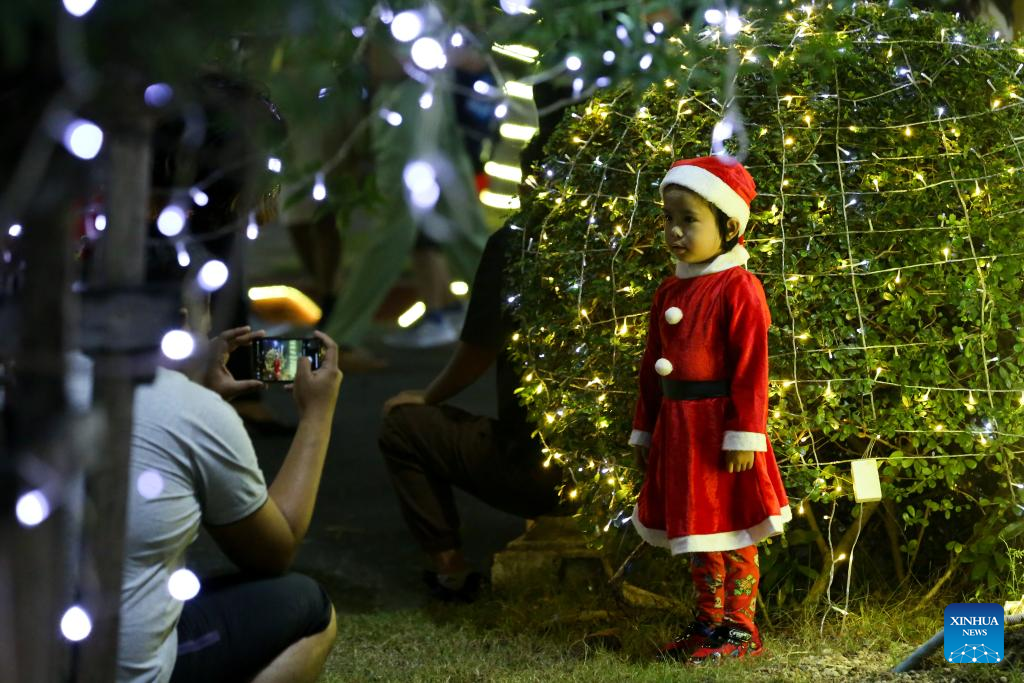 A child poses for a photo with a light installation at a church on Christmas in Yangon, Myanmar, Dec. 25, 2024. (Xinhua/ Myo Kyaw Soe)