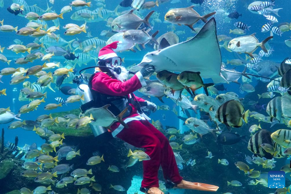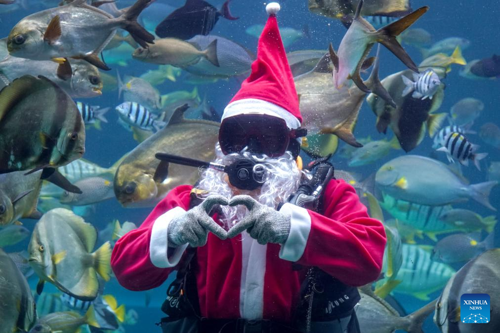 A diver dressed as Santa Claus performs at an aquarium restaurant in Badung Regency, Bali, Indonesia, on Dec. 25, 2024. (Photo by Dicky Bisinglasi/Xinhua)