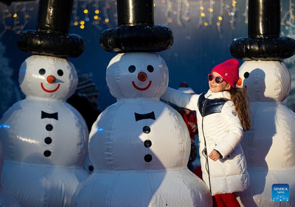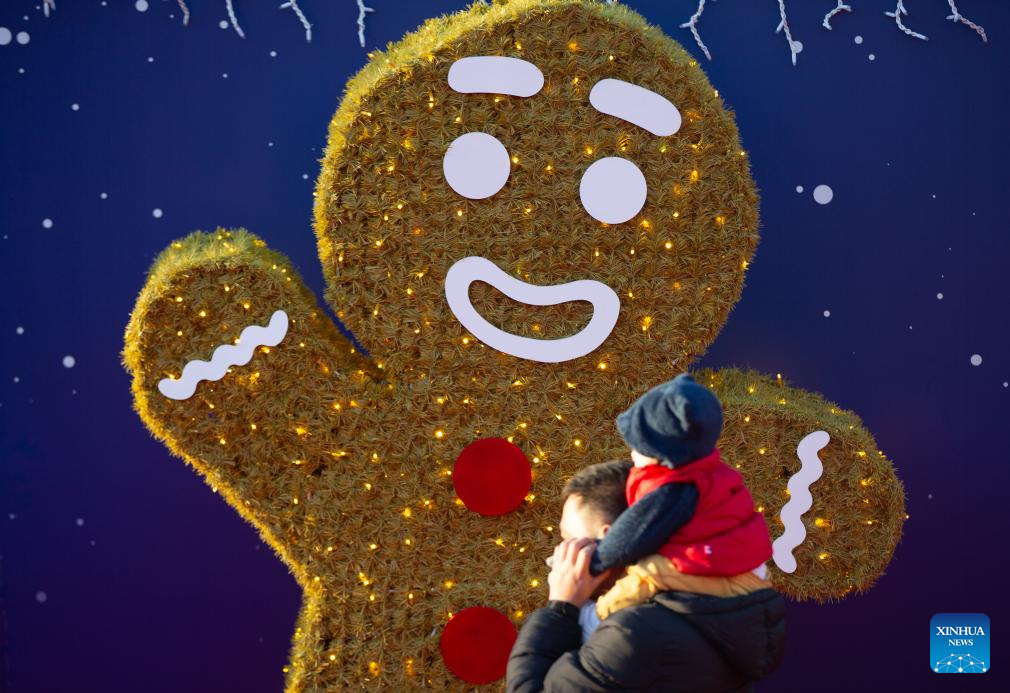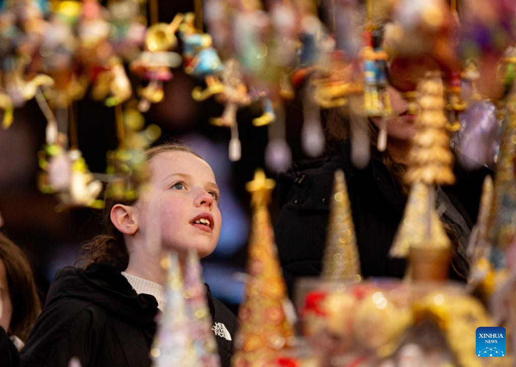 A girl looks at Christmas decorations at Piazza Navona in Rome, Italy, Dec. 24, 2024. (Xinhua/Li Jing)