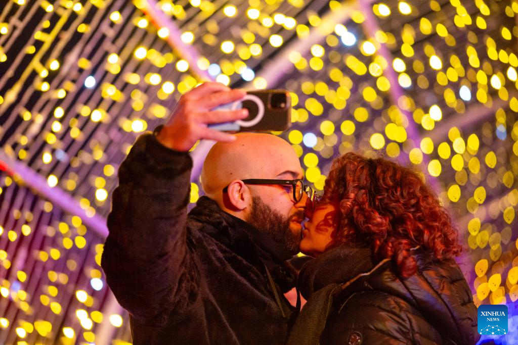 People pose for a selfie with festive lights at Villa Borghese in Rome, Italy, Dec. 25, 2024. (Xinhua/Li Jing)