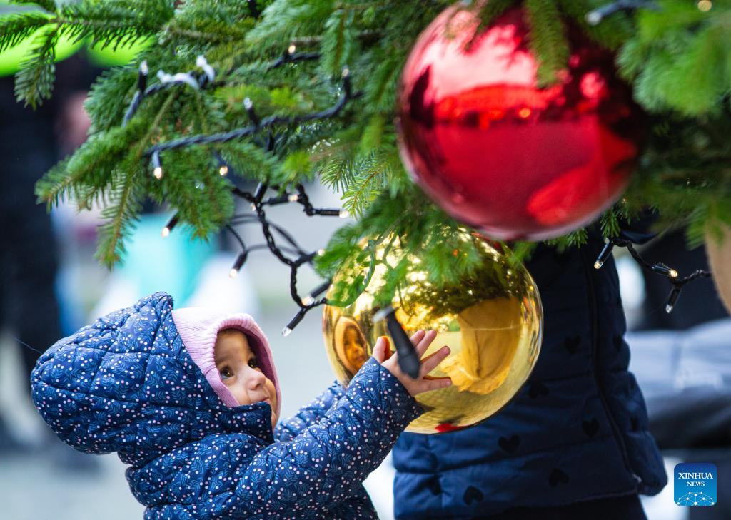 A kid plays with decorations of a Christmas tree at Piazza Navona in Rome, Italy, Dec. 24, 2024. (Xinhua/Li Jing)