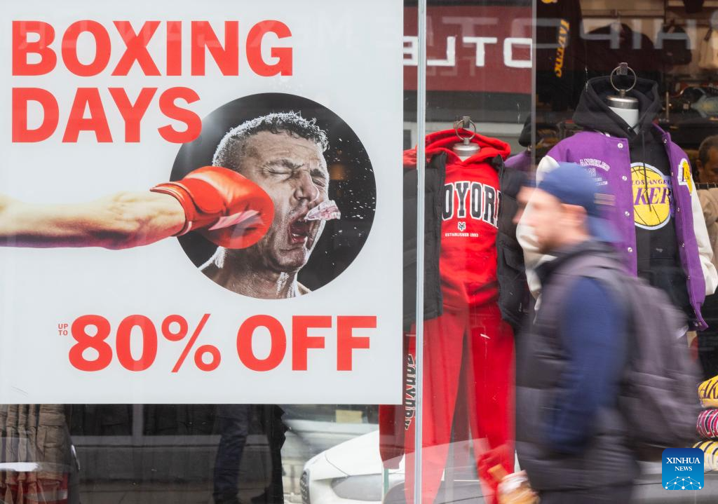 People walk past a Boxing Day promotion sign in Toronto, Canada, on Dec. 26, 2024. (Photo by Zou Zheng/Xinhua)
