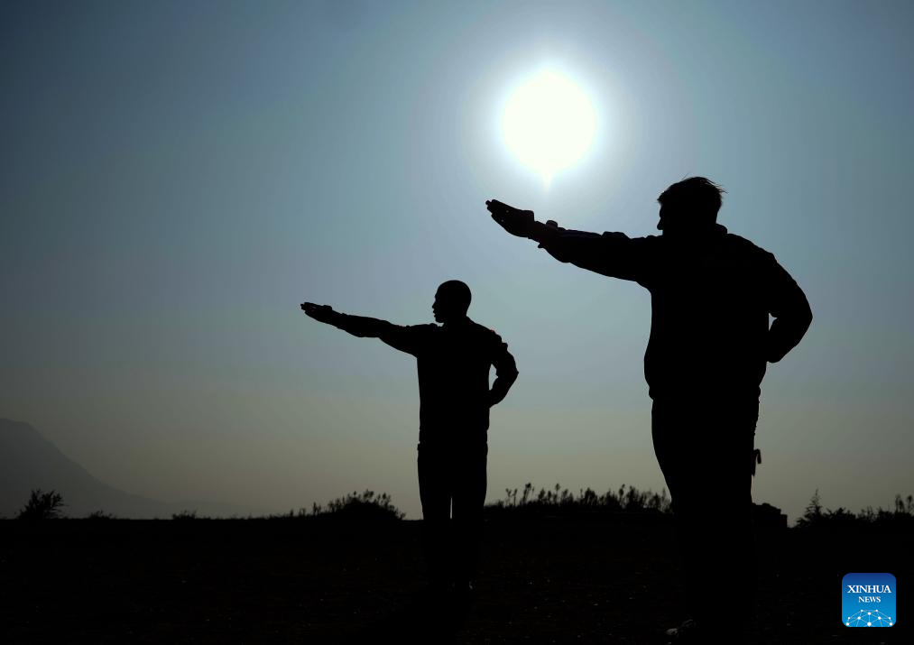 Mohammad Ullah (front) practices xiaohongquan boxing at Shaolin Epo Martial Arts School in Dengfeng, central China's Henan Province, Oct. 29, 2024. (Xinhua/Li Jianan)
