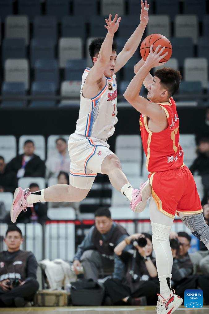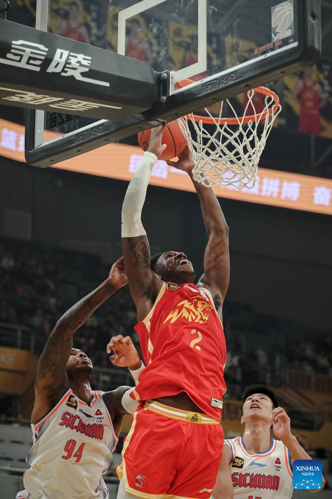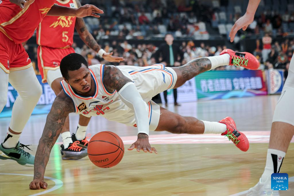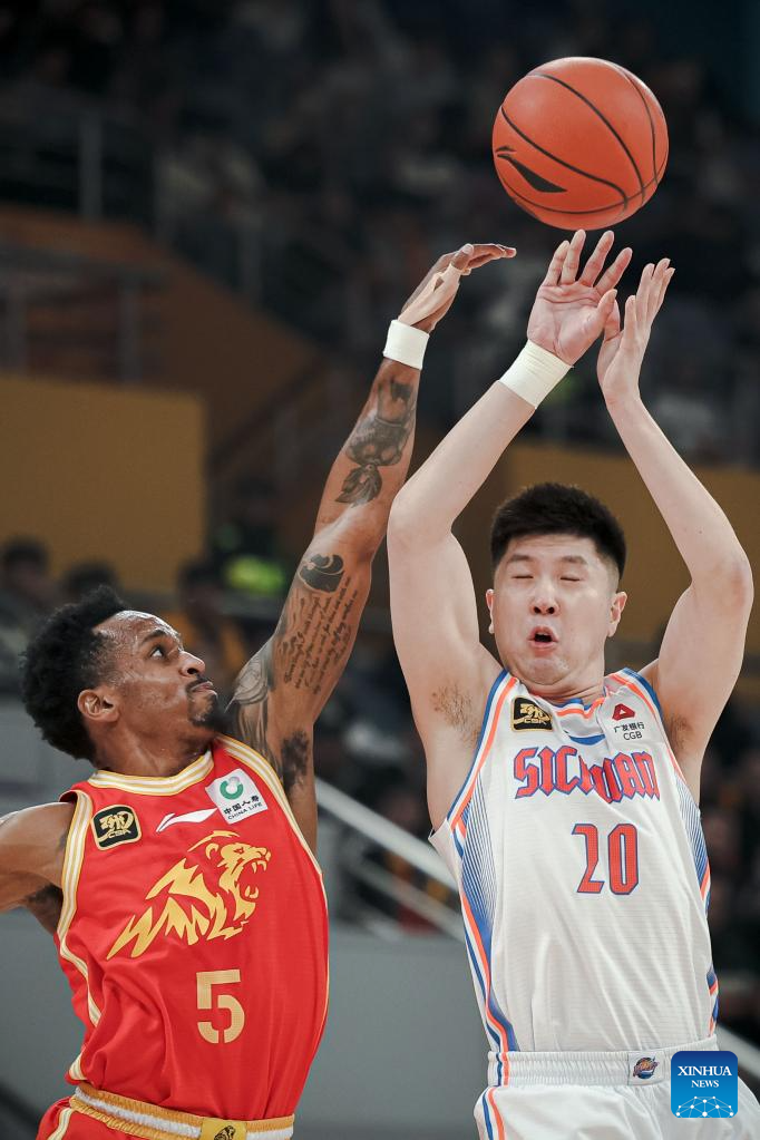 Barry Brown (L) of Zhejiang Lions challenges Wang Xinkai of Sichuan Blue Whales during a match at the 2024-2025 season of the Chinese Basketball Association (CBA) league in Hangzhou, east China's Zhejiang Province, Dec. 26, 2024. (Xinhua/Jiang Han)