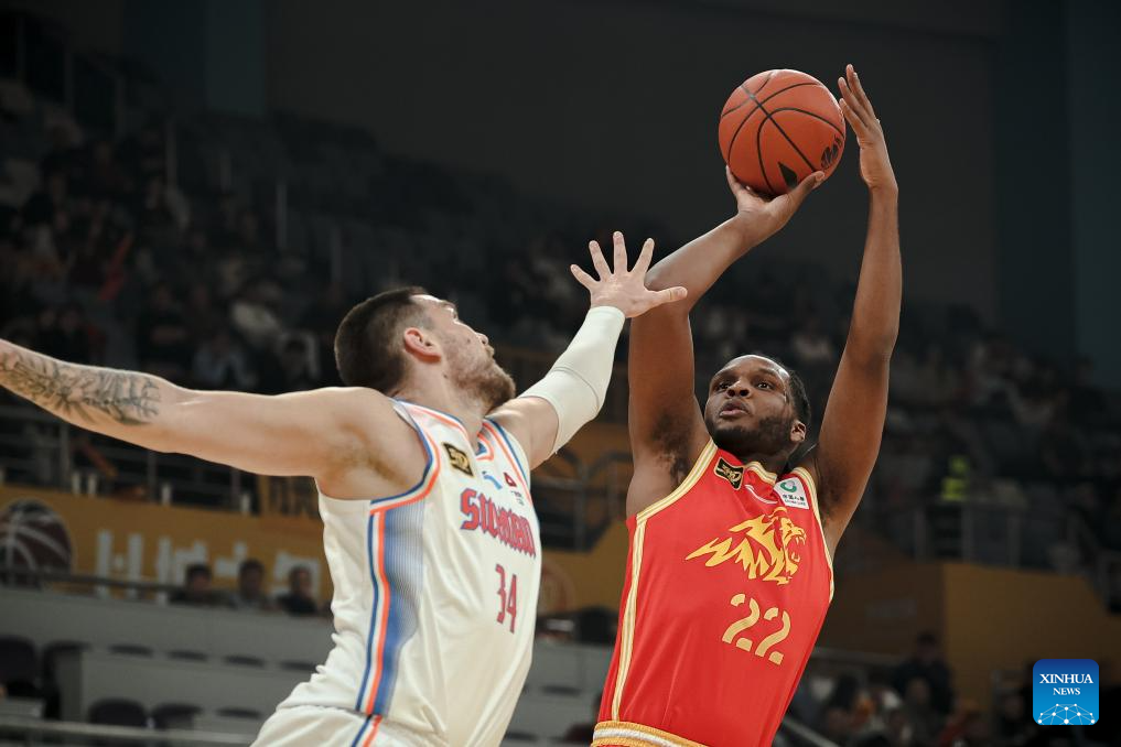 Josh Carlton (R) of Zhejiang Lions shoots the ball against Marin Maric of Sichuan Blue Whales during a match at the 2024-2025 season of the Chinese Basketball Association (CBA) league in Hangzhou, east China's Zhejiang Province, Dec. 26, 2024. (Xinhua/Jiang Han)