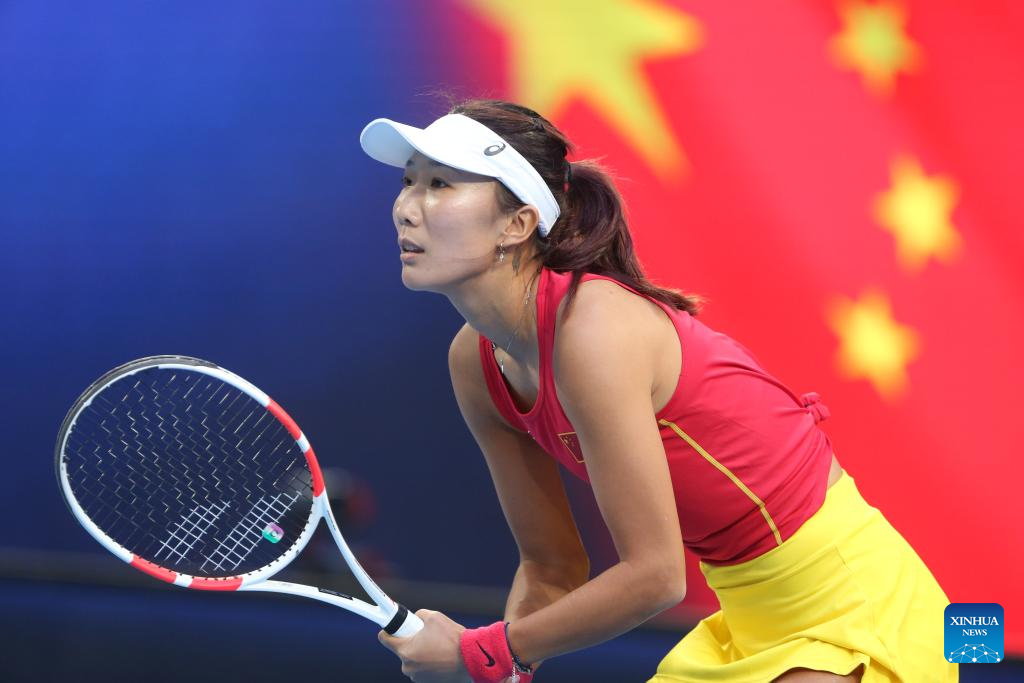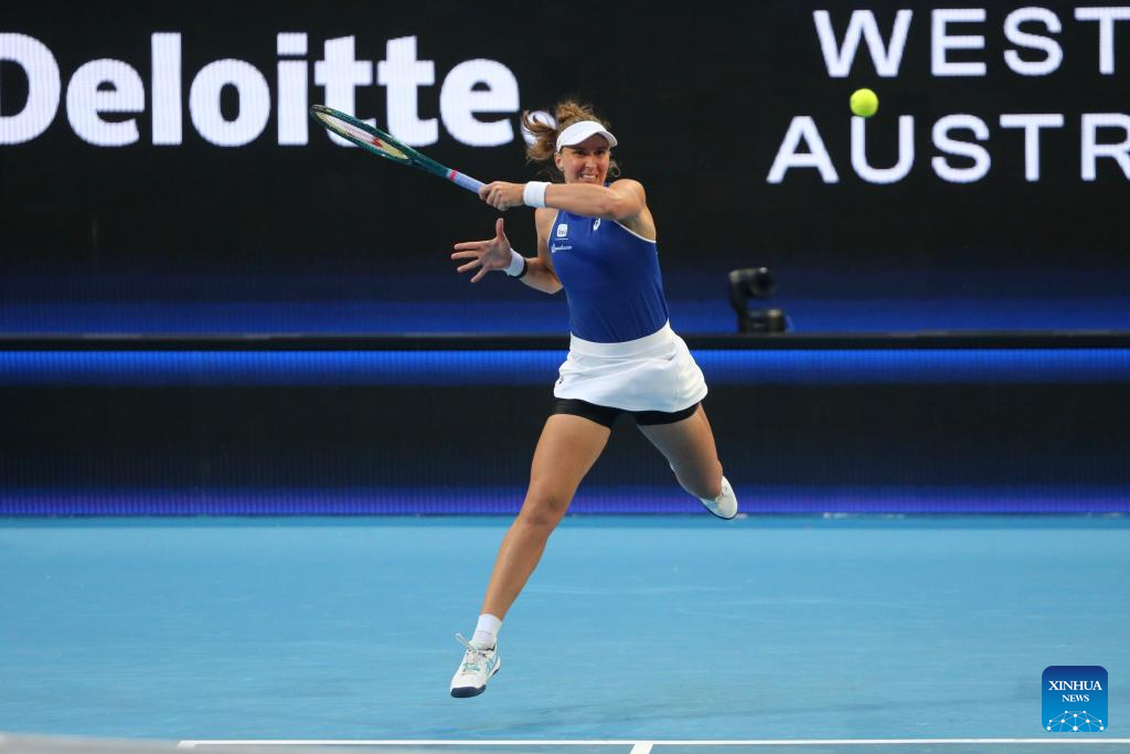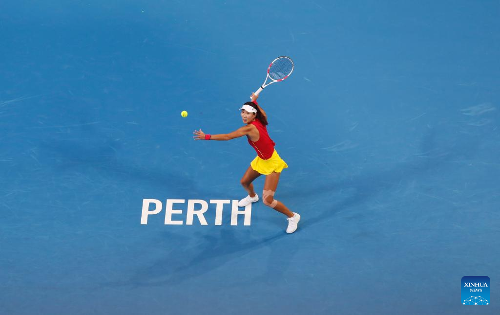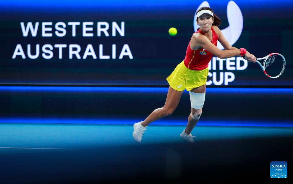 Gao Xinyu of China hits a return during the women's singles match against Beatriz Haddad Maia of Brazil in the Group E round robin match between China and Brazil at the 2025 United Cup tennis tournament in Perth, Australia, Dec. 27, 2024. (Xinhua/Ma Ping)