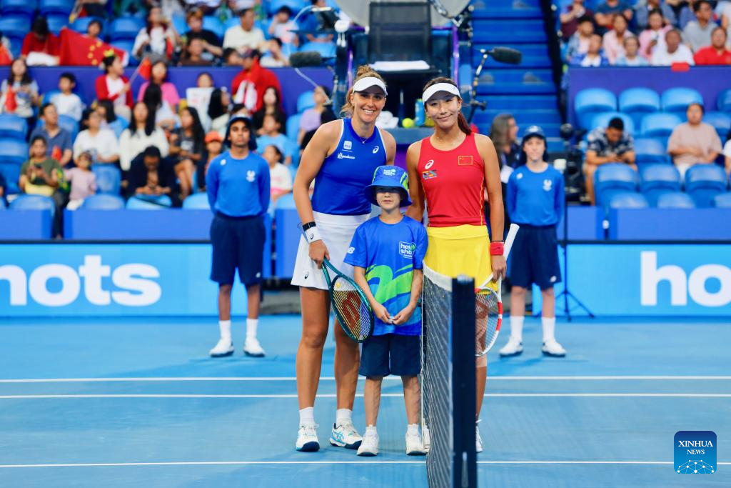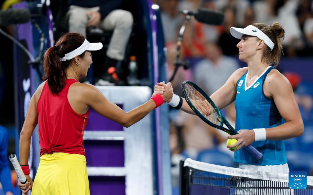 Gao Xinyu (L) of China shakes hand with Beatriz Haddad Maia of Brazil after their women's singles match in the Group E round robin match between China and Brazil at the 2025 United Cup tennis tournament in Perth, Australia, Dec. 27, 2024. (Xinhua/Ma Ping)