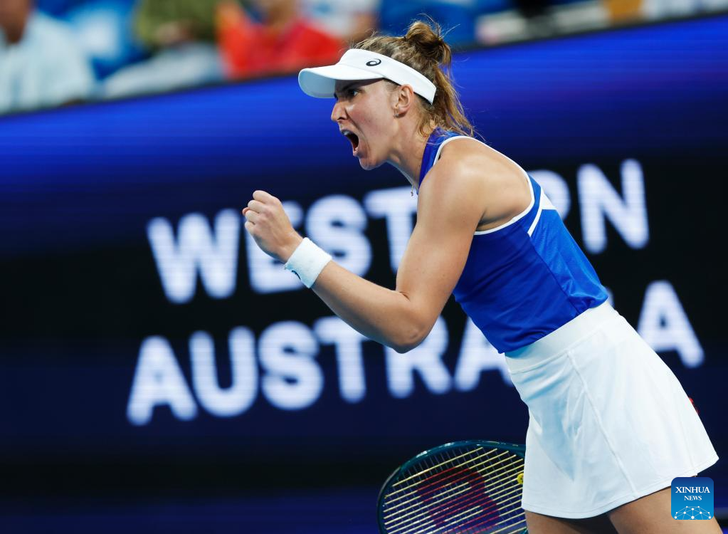 Gao Xinyu of China celebrates scoring during the women's singles match against Beatriz Haddad Maia of Brazil in the Group E round robin match between China and Brazil at the 2025 United Cup tennis tournament in Perth, Australia, Dec. 27, 2024. (Xinhua/Ma Ping)