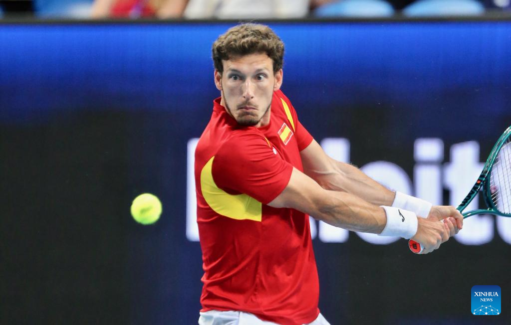 Pablo Carreno Busta of Spain hits a return during the men's singles match against Stefanos Tsitsipas of Greece in the Group C round robin match between Greece and Spain at the 2025 United Cup tennis tournament in Perth, Australia, Dec. 28, 2024. (Photo by Zhou Dan/Xinhua)